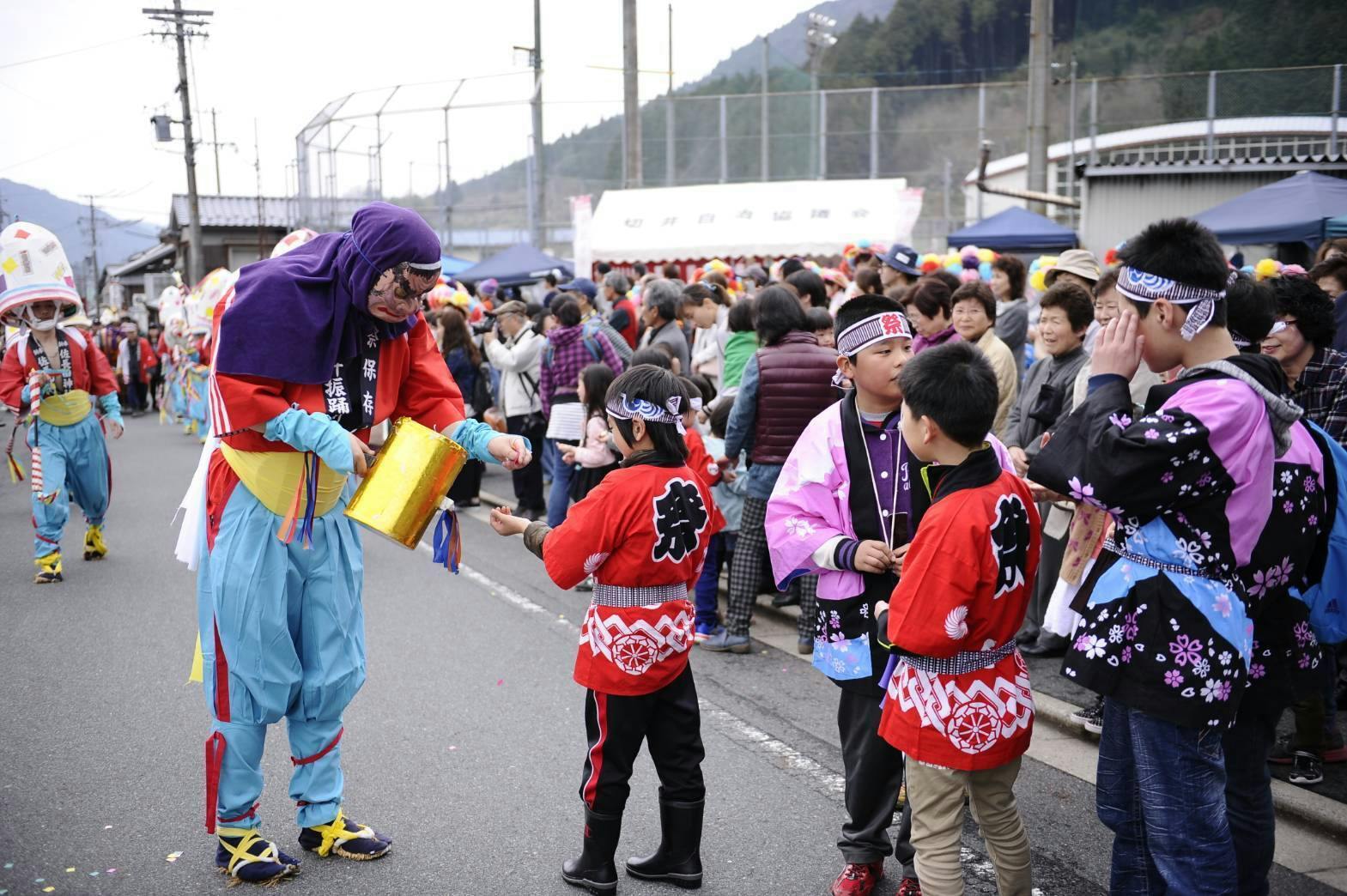 鬼の面が怖くて泣き出す子供達に、小槌から飴を取り出すと、子供たちは笑顔に変わります。