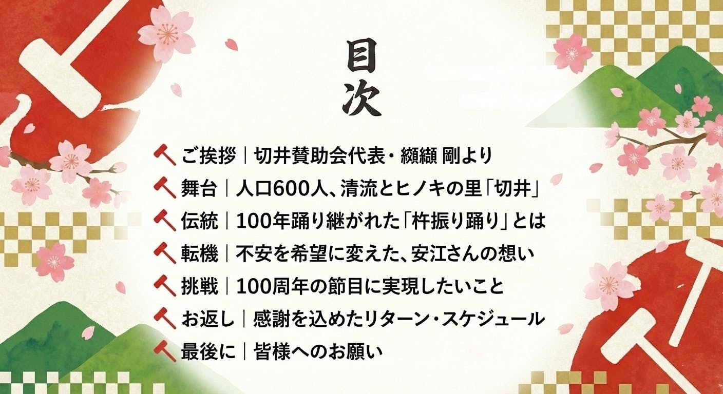 2026年4月12日、切井杵振り踊りは記念すべき「100周年」を迎えます。この大きな節目を盛大に祝いながらも、次の100年へ繋ぐためには、人だけでなく、維持していく為の資金集めが重要なカギとなります。