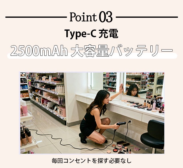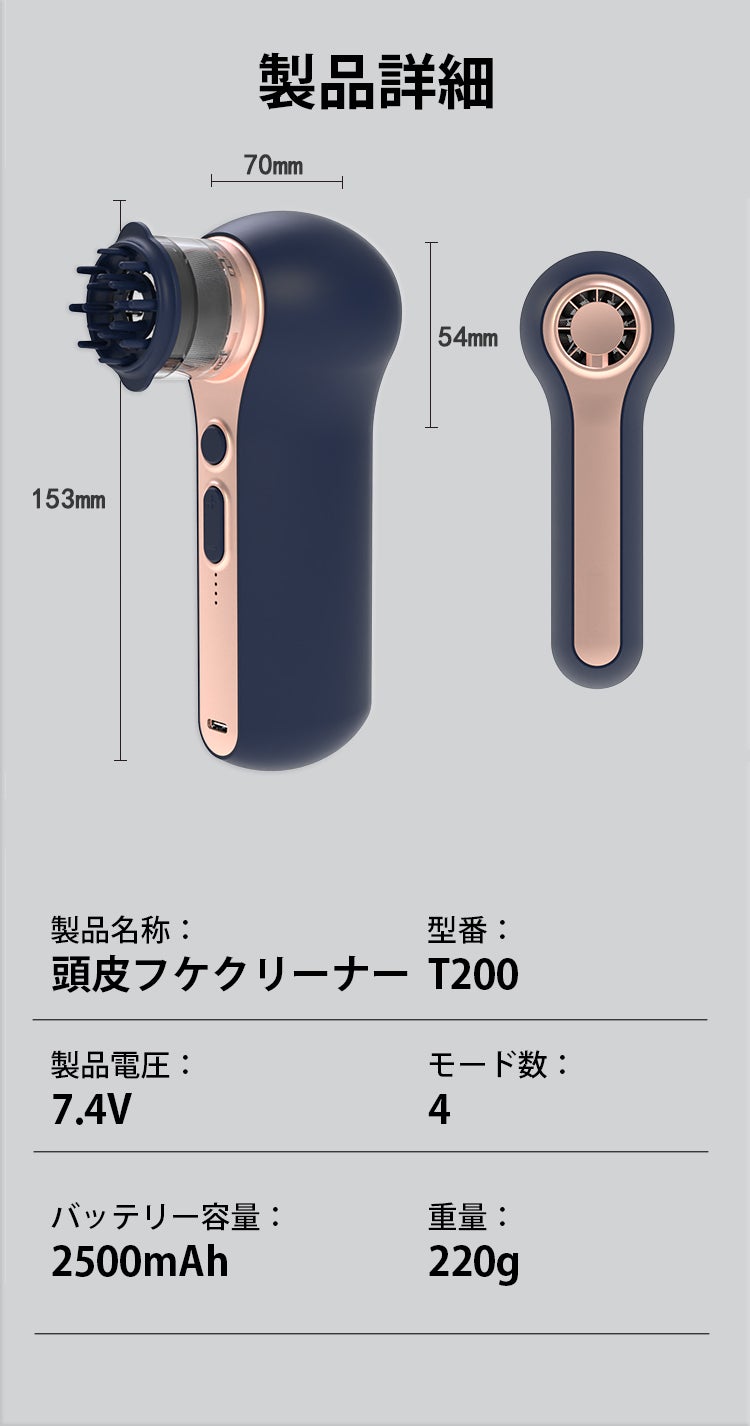 さらに、2500mAhの大容量バッテリーを内蔵することで、一度の充電で長時間の運転を実現しました。充電環境に左右されずに使い続けられるため、外出中や移動先でもフケケアを中断することなく行えます。