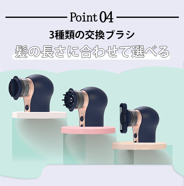 髪の長さや状態に応じて選べる3種類の交換ブラシが付属しています。それぞれ毛先の密度や形状が異なるため、長髪から短髪まで幅広いスタイルに適したケアが行えます。
