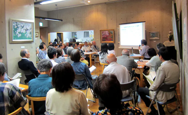 (老若男女問わず人気の「ライブラリーカフェ」。毎年年に12回ほど開催しています。この時のテーマは「橋本左内は刑場で泣いたか」でした。講師のお話が終わり、質疑応答が始まるまでの間に、コーヒーとスイーツで一息つきます)