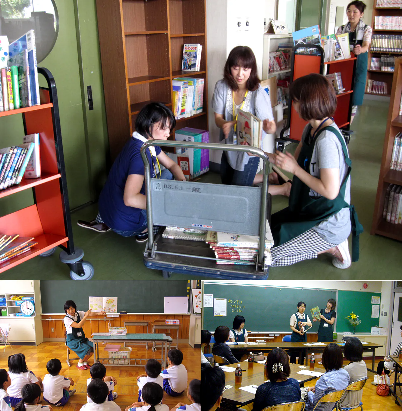 (上:学校図書館整備支援(書架移動)作業風景、左:授業に入っての資料説明、右:学校ボランティアさん対象の読み聞かせ研修)
