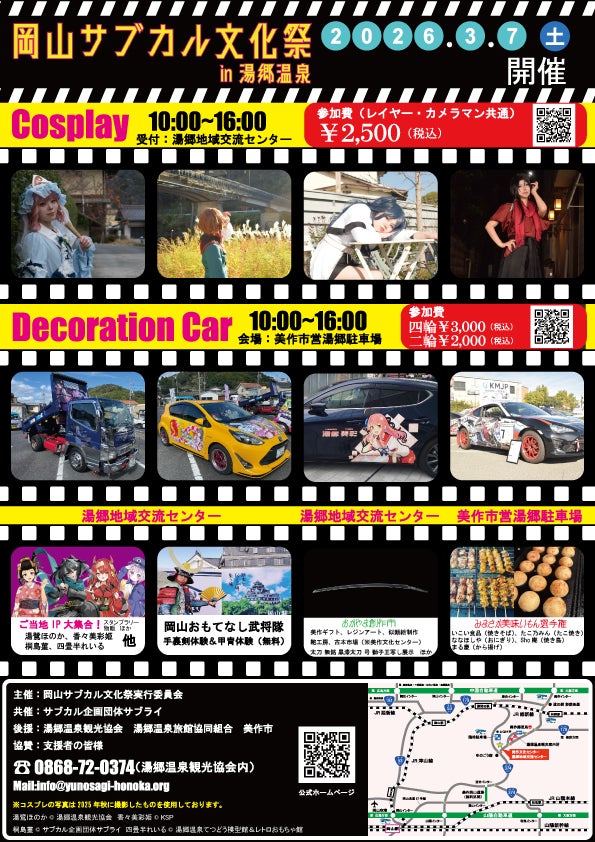 岡山サブカル文化祭実行委員会です。 2026年3月7日(土)に岡山県美作市の湯郷温泉にて【岡山サブカル文化祭in湯郷温泉2026】を開催いたします。 ご当地IPを軸に、岡山の県北にサブカル文化を根付かせ、持続可能なコンテンツツーリズムを構築するきっかけのイベントにしたいと考えております。