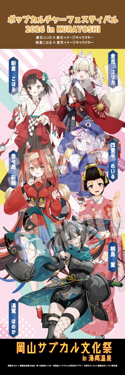 ちなみに全員集合と、ほのかちゃん&倉吉ユリカちゃん、ほのかちゃん&新倉こはるちゃんの3パターンは、1枚ずつポップカルチャーフェスティバルさんに進呈させていただくことになっておりますので、3/7開催の岡山サブカル文化祭in湯郷温泉2026と3/22開催のポップカルチャーフェスティバルin倉吉の両方でこの幟をご覧いただけるかと思います。