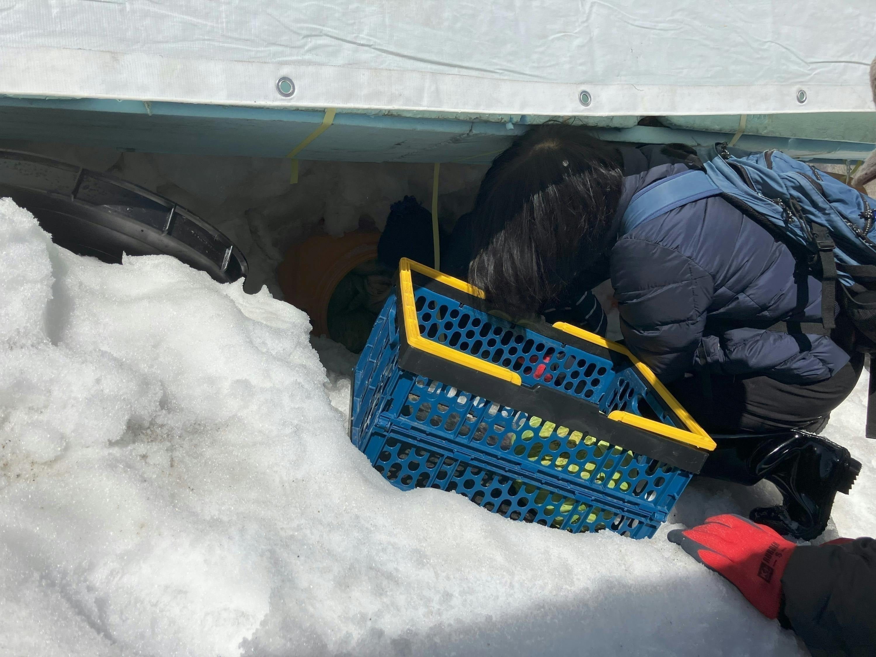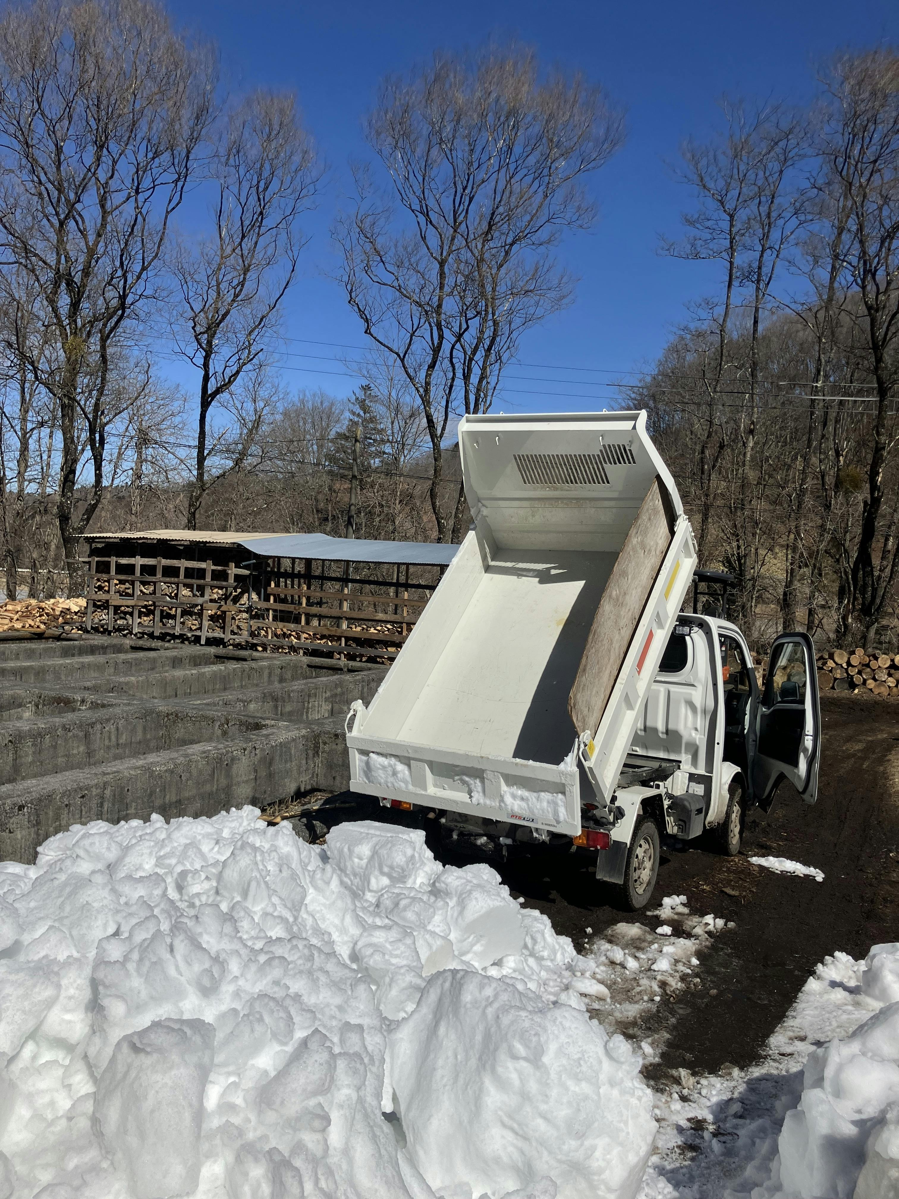 氷室内のキャベツ設置場所を製作、キャベツの格納が終了し、風越公園屋外スケートリンクの削り氷を運搬しています。