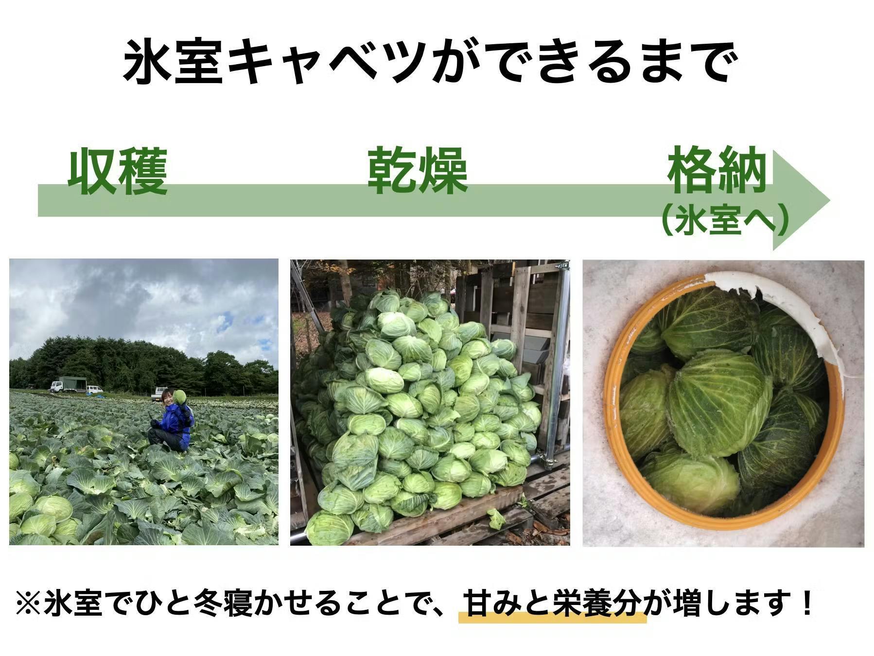 軽井沢近郊で地物のキャベツが手に入らない冬場から春先に、鮮度が高く甘みの増したキャベツを食卓におお届けしたいです。風越公園屋外スケートリンクの削り氷で製作した氷室でキャベツを冬季期間眠らせることで、鮮度を保ち、甘みと栄養分が増した状態で皆さまに召し上がっていただくことができます。