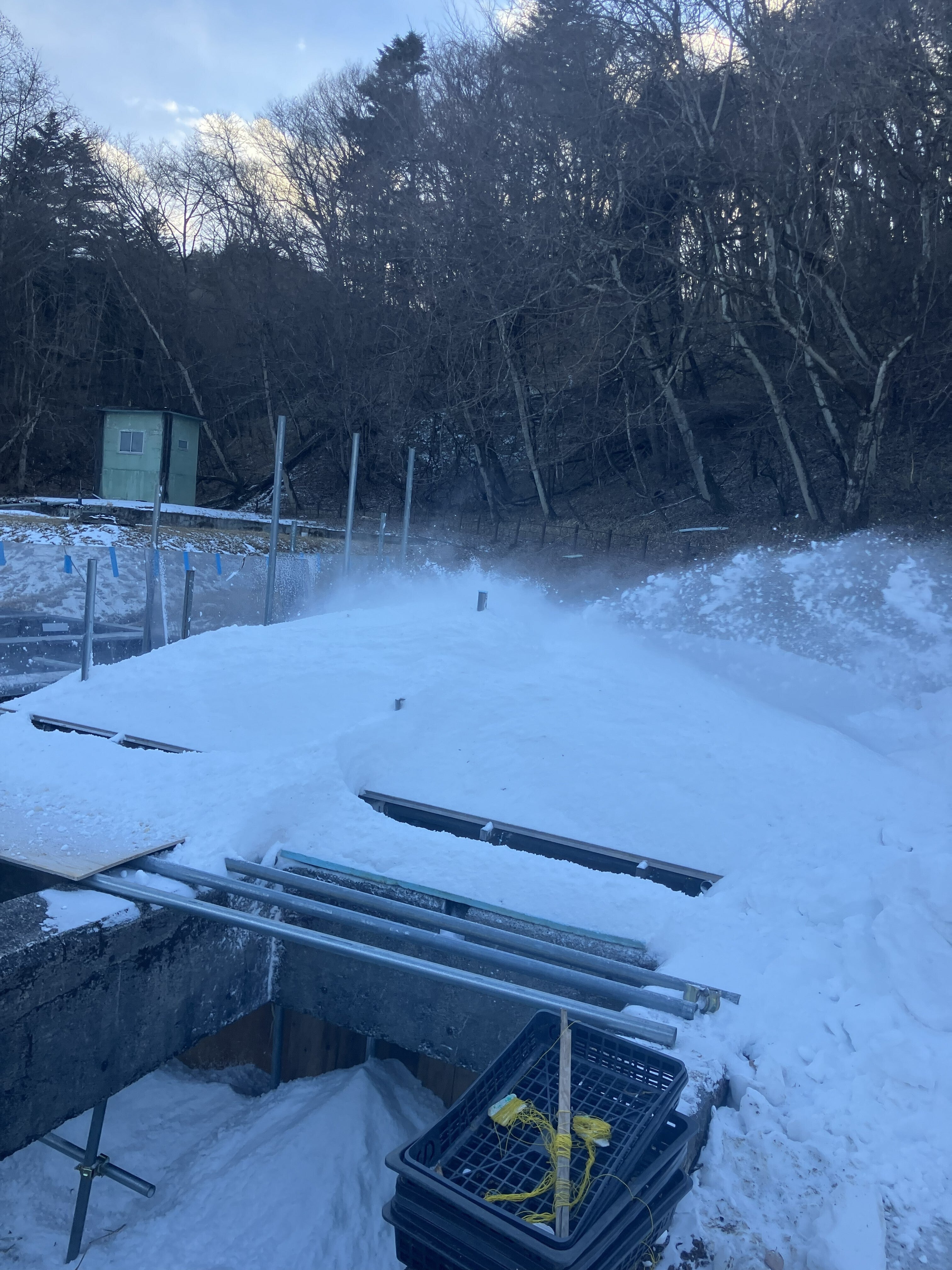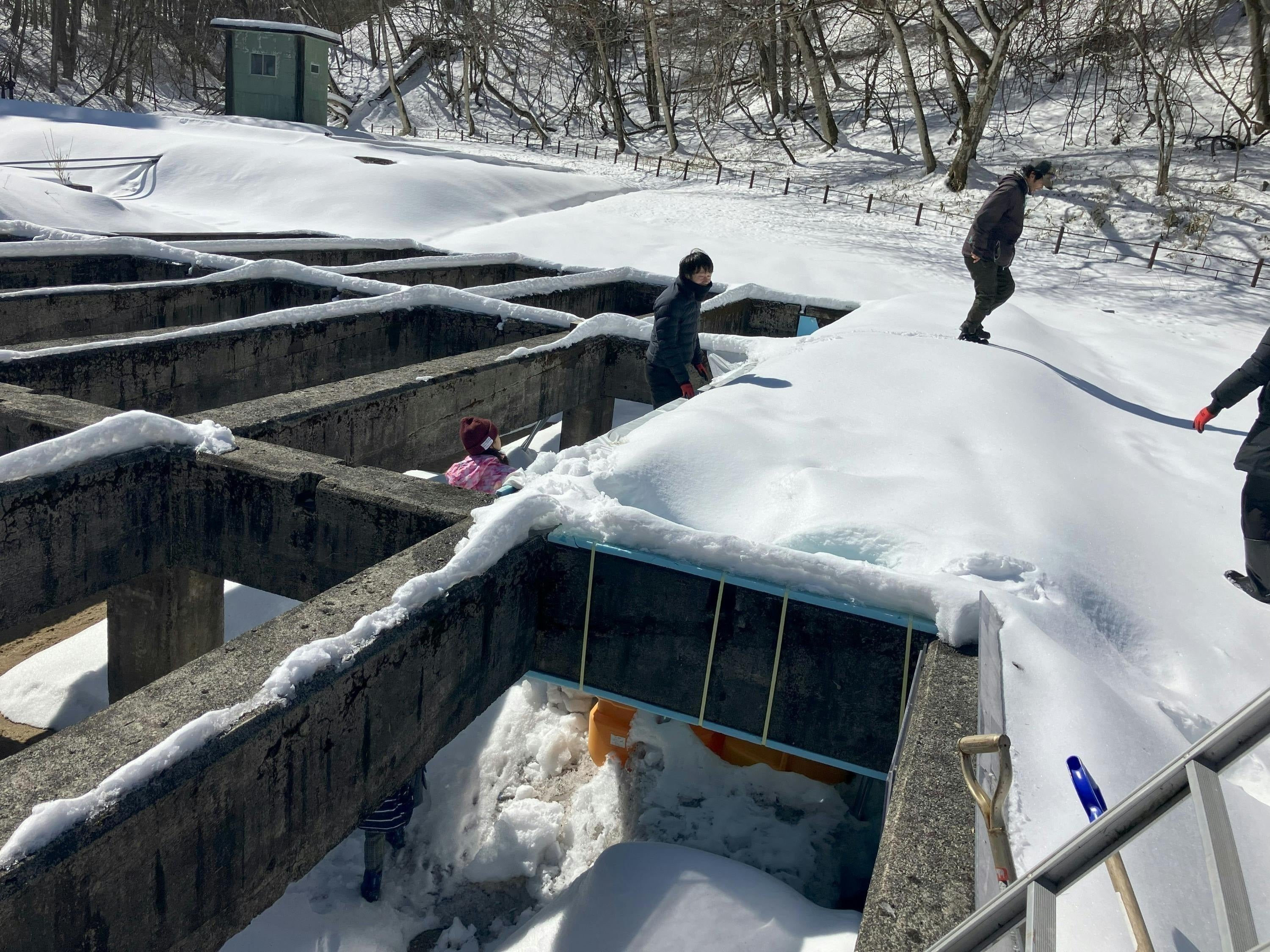 氷室内のキャベツ設置場所を製作、キャベツの格納が終了し、風越公園屋外スケートリンクの削り氷を運搬しています。