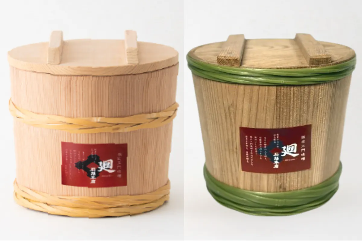 今回、170周年記念として開発した味噌を、佐藤さんの杉桶樽に入れて販売する、特別な商品「プレミアム木桶 廻-MEGURU-」をご用意いたしました。