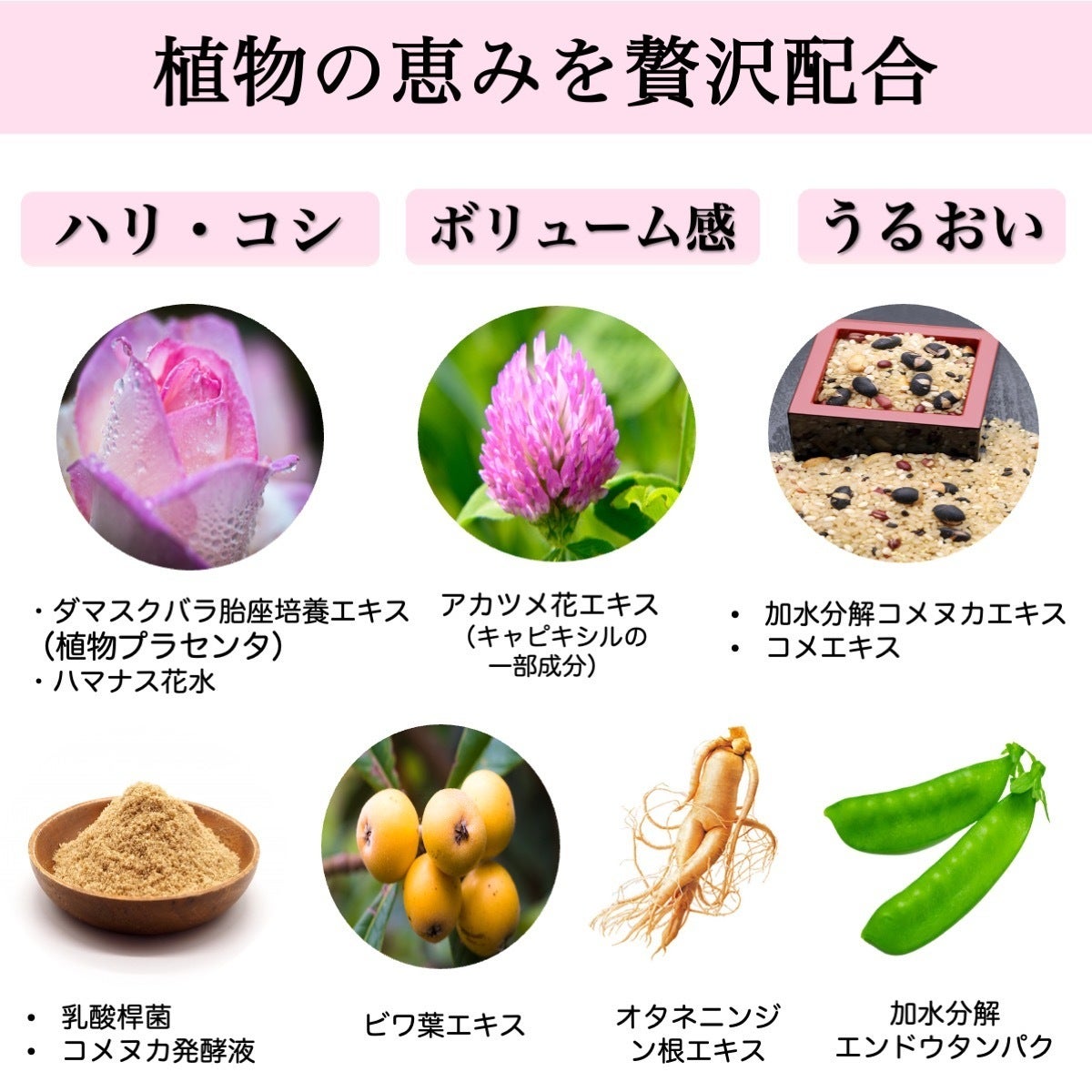 【全成分】水、BG、ペンチレングリコール、グリセリン、ヒト脂肪細胞順化培養液エキス、ヒトオリゴペプチド-13 、ダマスクバラ胎座培養エキス、ビオチノイルトリペプチド-1、パンテノール、アセチルテトラペプチド-3、アカツメクサ花エキス、ハマナス花水、ビワ葉エキス、乳酸桿菌/コメヌカ発酵液、加水分解コメヌカエキス、コメエキス、オタネニンジン根エキス、加水分解エンドウタンパク、加水分解コラーゲン、ヒアルロン酸Na、オリーブ果実油、 (アクリレーツ/アクリル酸アルキル(C10-30))クロスポリマー、PEG-60水添ヒマシ油、ヒドロキシエチルセルロース、水酸化K、フェノキシエタノール、(クエン酸/乳酸/リノール酸/オレイン酸)グリセリル、ポリソルベート60、1,2-ヘキサンジオール、カプリリルグリコール、トロポロン、デキストラン、グリオキサール、クエン酸、プロテアーゼ