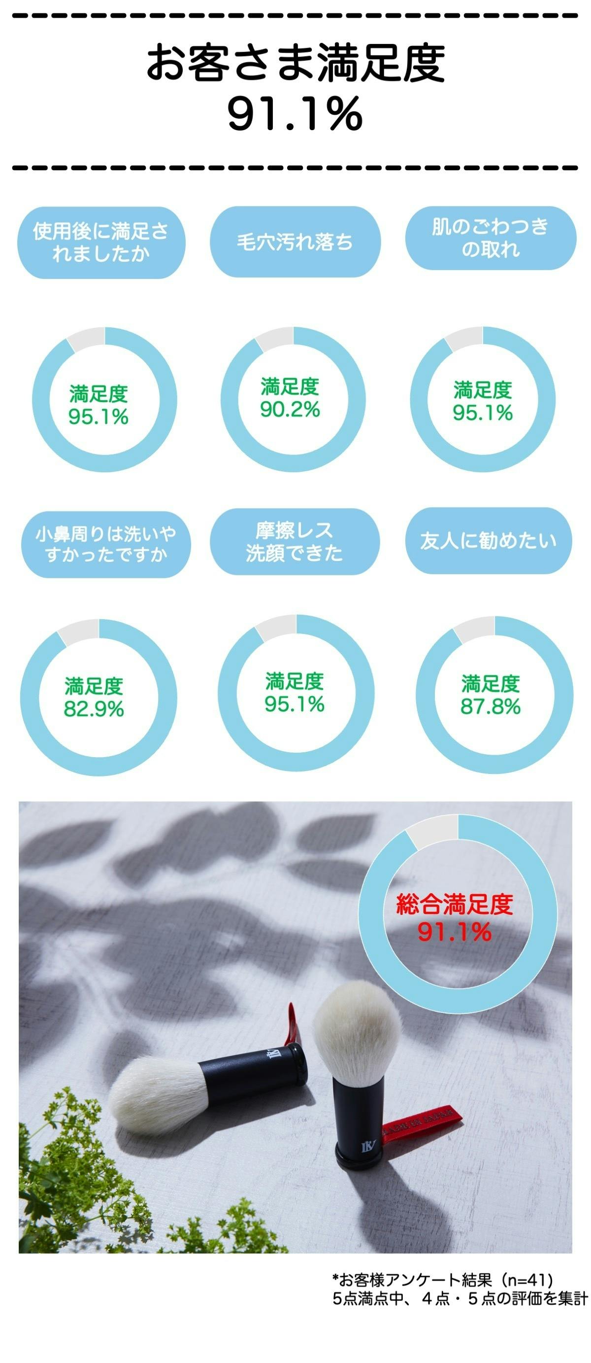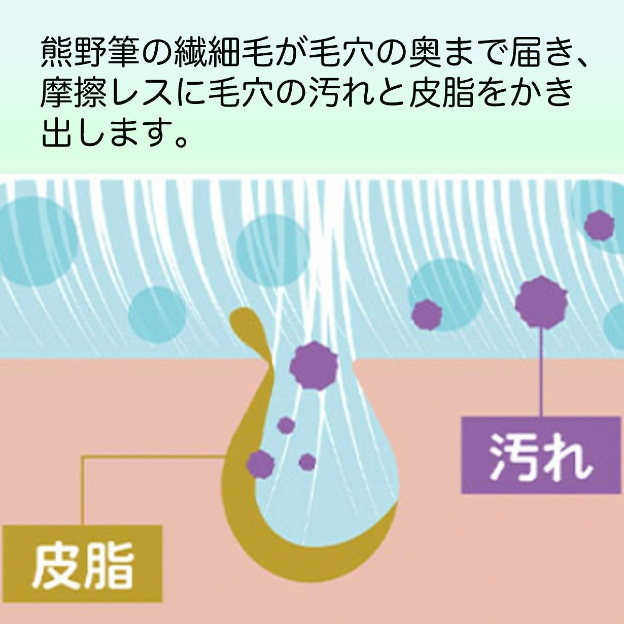 役割の異なる二層の毛が毛穴の凹凸にしっかりと食い込むため、軽い力で透明感のあるツヤやかな素肌へと導きます。毛素材もこだわり、優しく洗顔でき、泡立ちが良いように粗光峰60%、PBT(合成繊維)40%と混毛比率にもこだわっています。