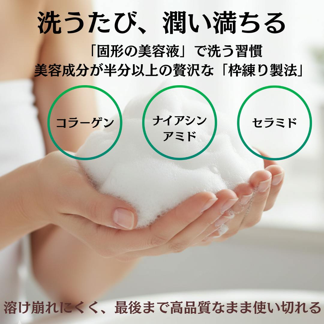 【全成分】石ケン素地、水、ヒト幹細胞順化培養液、ヒト脂肪由来間葉系細胞エクソソーム、ナイアシンアミド、ヒト遺伝子組換オリゴペプチド-1、ヒト遺伝子組換ポリペプチド-11、アスコルビルグルコシド、水添レチノール、水溶性プロテオグリカン、水溶性コラーゲン、ヒアルロン酸Na、セラミドNP、セラミドAP、セラミドEOP、コメヌカ油、オタネニンジン根エキス、カンゾウ根エキス、ハトムギ種子エキス、カミツレ花エキス、トウキ根エキス、ツボクサエキス、シロキクラゲ多糖体、アルニカ花エキス、シア脂、グリチルリチン酸2K、スクワラン、タウリン、リシンHCl、アラニン、ヒスチジンHCl、アルギニン、セリン、プロリン、グルタミン酸、トレオニン、バリン、ロイシン、グリシン、、イソロイシン、フェニルアラニン、アラントイン、フィトスフィンゴシン、モロッコ溶岩クレイ、アルギン酸Na、ホホバ種子油、オレンジ果皮油、レモン果皮油、ラベンダー油、ベルガモット果実油、アスコルビルメチルカルボニルペンタペプチド-72-トリ-t-ブチルトリプトファナミド、マンニトール、ポリソルベート80、炭