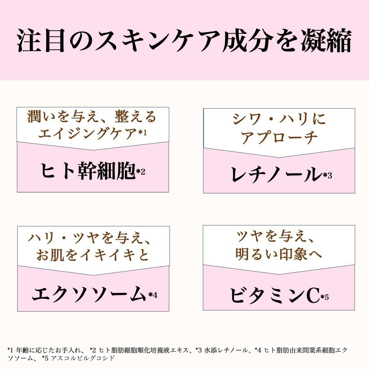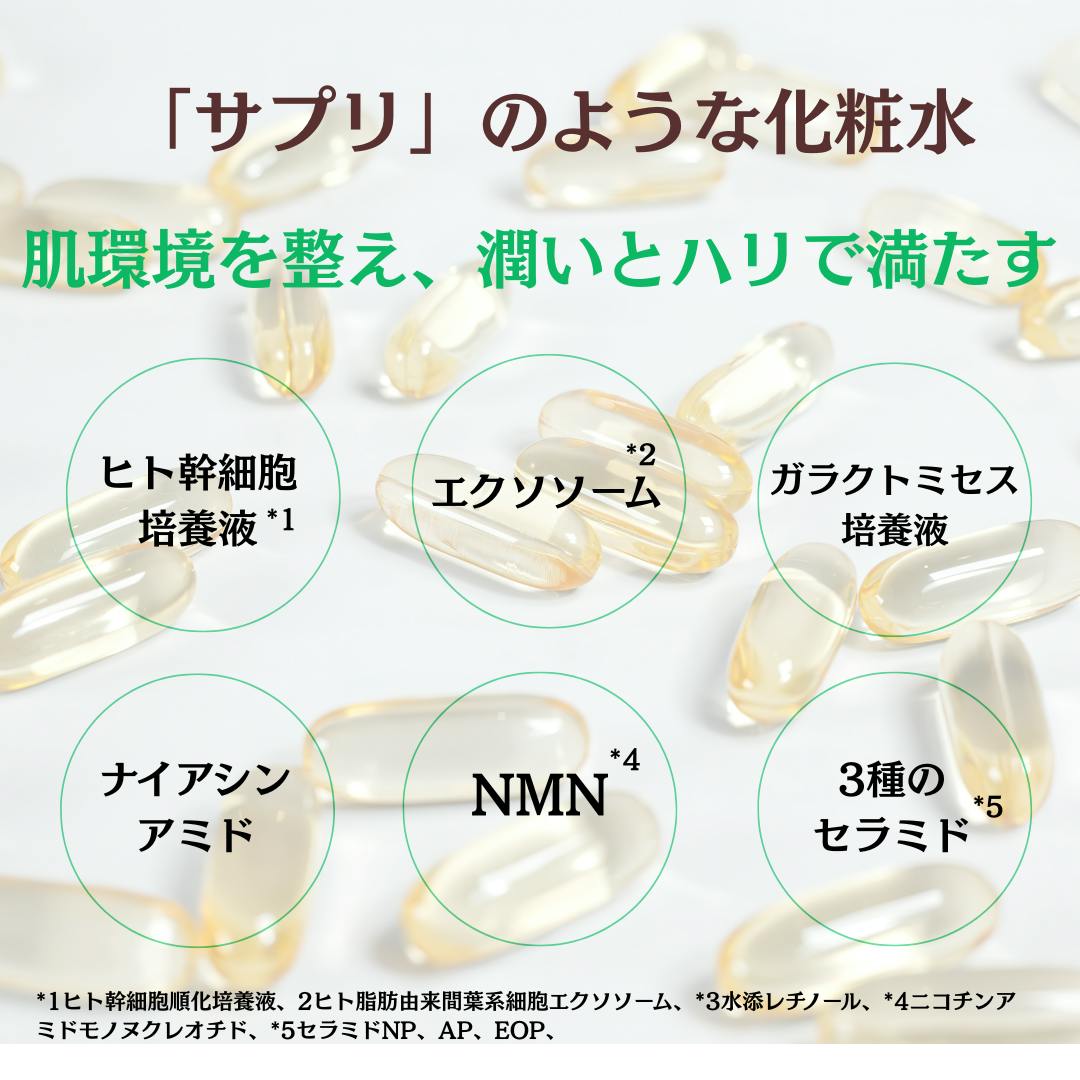 【全成分】水、DPG、グリセリン、ヒト幹細胞順化培養液、ガラクトミセス培養液、ヒト脂肪由来間葉系細胞エクソソーム、水添レチノール、ナイアシンアミド、アゼライン酸、ニコチンアミドモノヌクレオチド、ヒト線維芽細胞順化培養液、ヒト脂肪細胞順化培養液エキス、ヒト遺伝子組換オリゴペプチド-1、アスコルビン酸、アスコルビルリン酸Na、パルミチン酸アスコルビルリン酸3Na、テトラヘキシルデカン酸アスコルビル、リン酸アスコルビルMg、アスコルビルメチルカルボニルペンタペプチド-72-トリ-t-ブチルトリプトファナミド、セラミドNP、セラミドAP、セラミドEOP、ユビキノン、水溶性コラーゲン、ヒアルロン酸Na、コメヌカスフィンゴ糖脂質、コメヌカエキス、酒粕エキス、コメヌカ油、オタネニンジン根エキス、カンゾウ根エキス、トウキ根エキス、ハトムギ種子エキス、ヨモギ葉エキス、カミツレ花エキス、セイヨウオトギリソウ花/葉/茎エキス、フユボダイジュ花エキス、トウキンセンカ花エキス、ヤグルマギク花エキス、ローマカミツレ花エキス、マヨラナ葉エキス、ワイルドタイムエキス、シロキクラゲ多糖体、褐藻エキス、水溶性プロテオグリカン、BG、フラーレン、アルブチン、リシンHCl、ヒスチジンHCl、アルギニン、セリン、プロリン、グルタミン酸、ロイシン、イソロイシン、トコフェロール、酢酸トコフェロール、フィトスフィンゴシン、コレステロール、アラニン、トレオニン、バリン、グリシン、フェニルアラニン、タウリン、アラントイン、PEG/PPG/ポリブチレングリコール-8/5/3グリセリン、、スクワラン、トリプロピレングリコール、水添レシチン、PEG-60水添ヒマシ油、キサンタンガム、水酸化K、1,2-ヘキサンジオール、カプリリルグリコール
