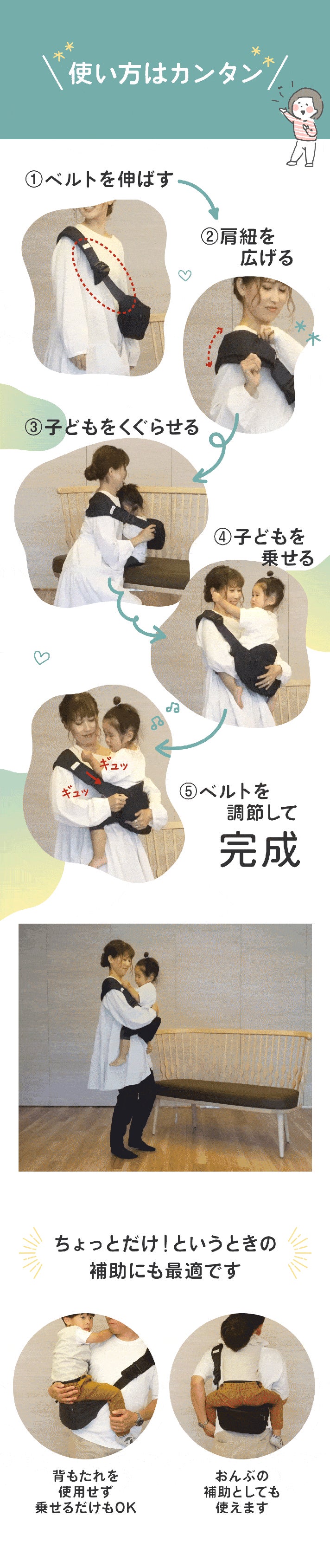 A:お子さんが嫌がった時は、無理に使用を続けるのではなく、心地よい体験を増やしながら、使用を続けてみてください。不安な方は、ベルトの調節の仕方や、抱っこの位置を人形等で確認してから、お子様を初めて抱っこして頂くことをお勧め致します。