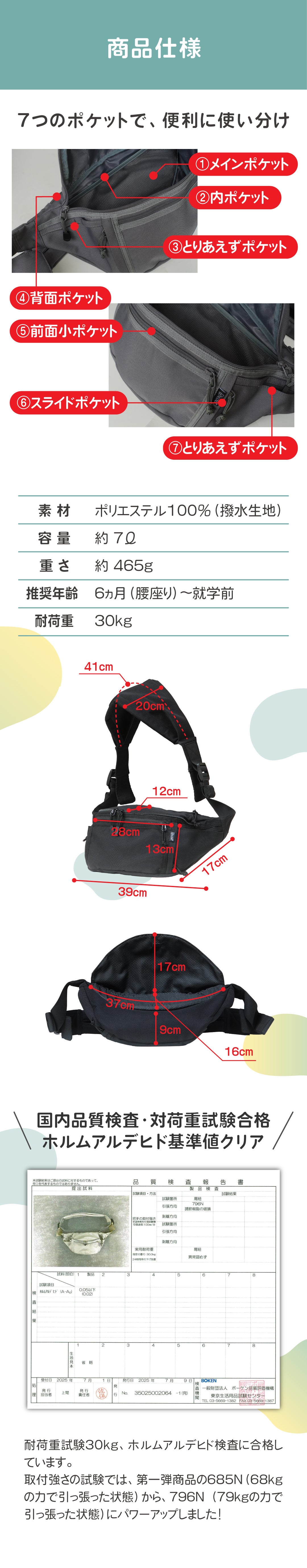 A:耐荷重は30㎏で合格し、把手の取付の検査では79㎏の力で引っ張った際まで問題ないとご報告頂きましたが、安全の為腰が座った生後6か月頃から、6歳頃までのご使用をお願い申し上げます。