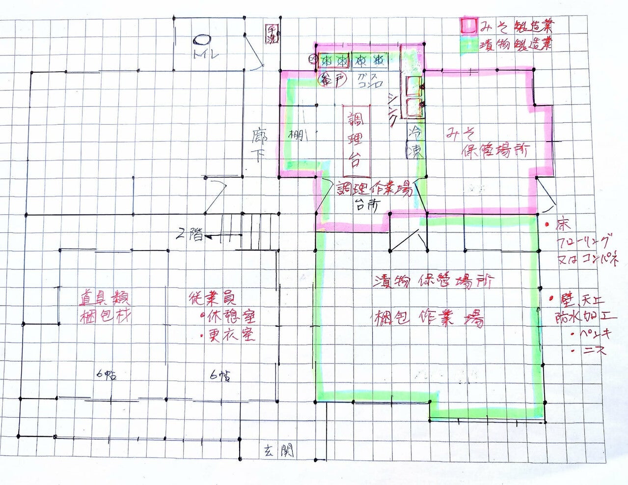 ピンクのマーカー部分と、ミドリのマーカー部分のリノベーションを行い、営業許可を取得します。