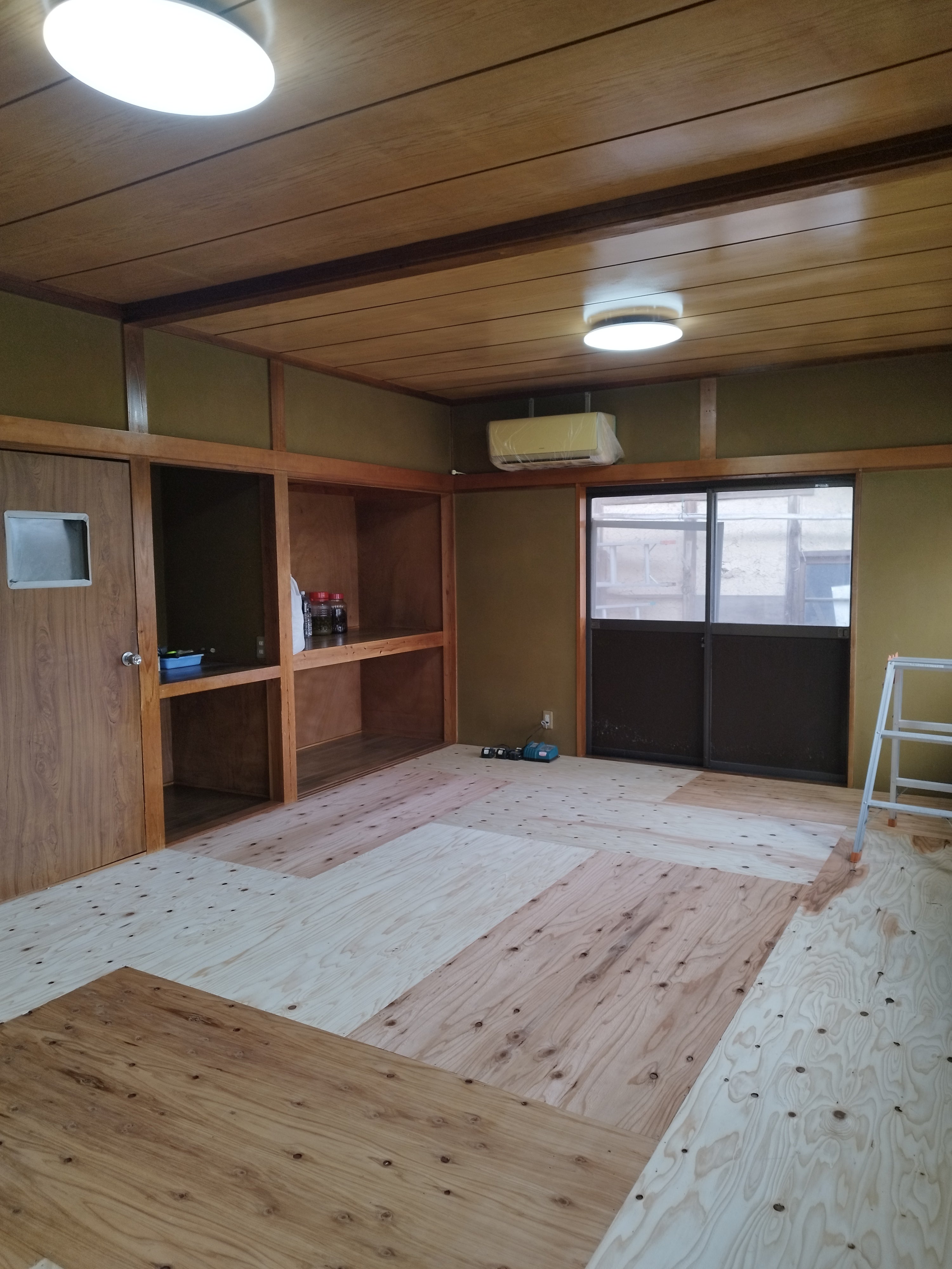 畳をはがし、床にコンパネを敷いて、壁と天井と床にニスを塗り、全面水拭きできるように整えました。