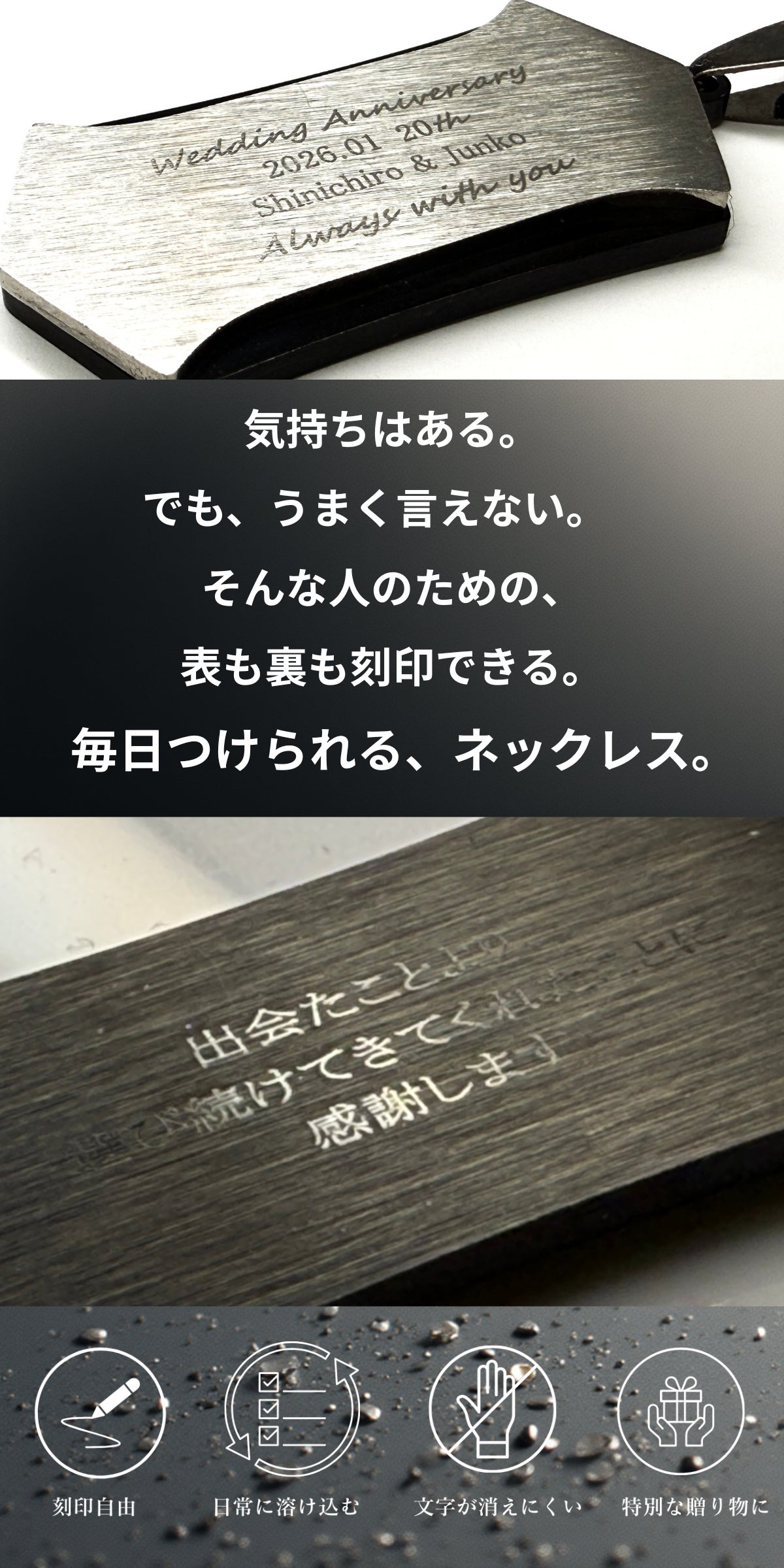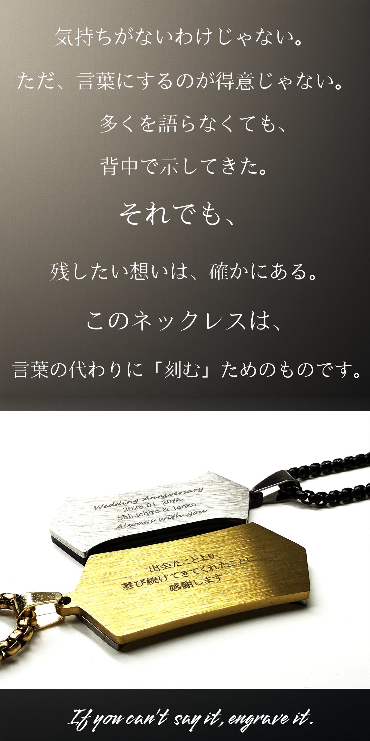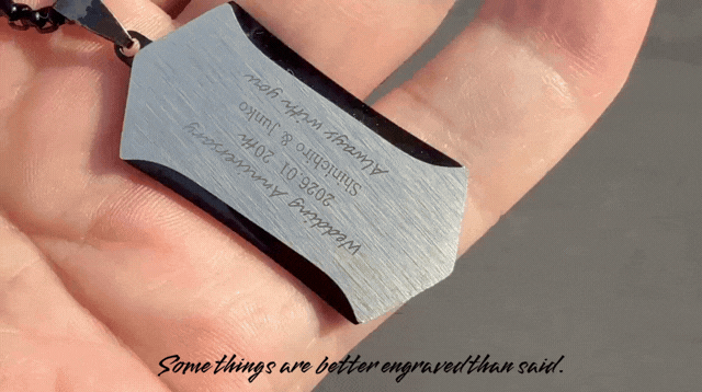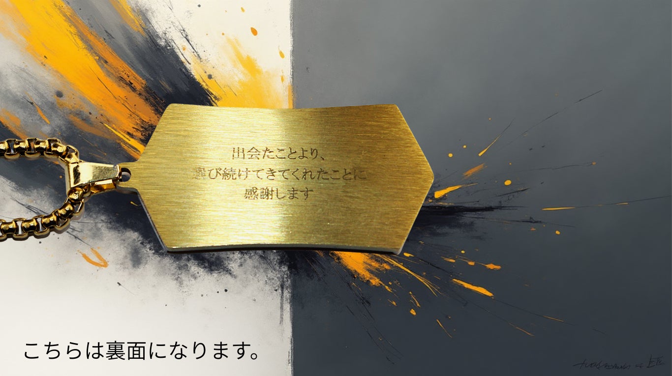 言葉にできなかった想いは、弱さではありません。多くを語らず、行動で示してきたからこそ、言葉が追いつかないだけのこともある。このネックレスは、そんな人のための選択肢です。表に刻む言葉も、裏に刻む言葉も、正解はありません。あなたが「残したい」と思ったものが、そのまま意味になります。誰かのためでもいい。自分のためでもいい。あるいは、その両方でもいい。刻んだ言葉が、ふとした瞬間に視界に入り、触れた指先で思い出される。それだけで、このネックレスは役目を果たします。言えなかった想いを、なかったことにしないために。どうか、あなた自身の言葉を刻んでください。言えないなら、刻めばいい。