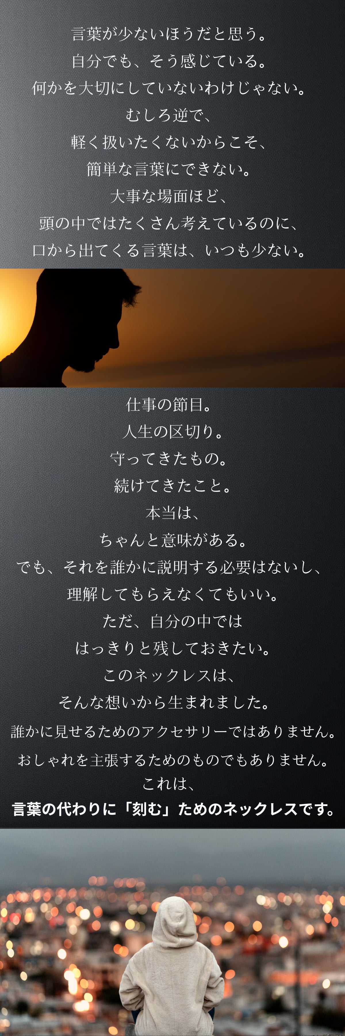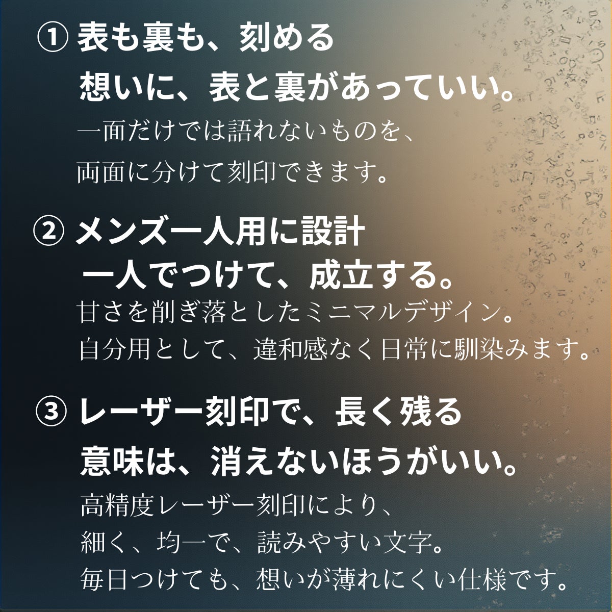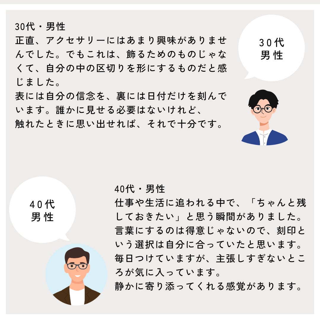 言葉にできなかった想いは、弱さではありません。多くを語らず、行動で示してきたからこそ、言葉が追いつかないだけのこともある。このネックレスは、そんな人のための選択肢です。表に刻む言葉も、裏に刻む言葉も、正解はありません。あなたが「残したい」と思ったものが、そのまま意味になります。誰かのためでもいい。自分のためでもいい。あるいは、その両方でもいい。刻んだ言葉が、ふとした瞬間に視界に入り、触れた指先で思い出される。それだけで、このネックレスは役目を果たします。言えなかった想いを、なかったことにしないために。どうか、あなた自身の言葉を刻んでください。言えないなら、刻めばいい。