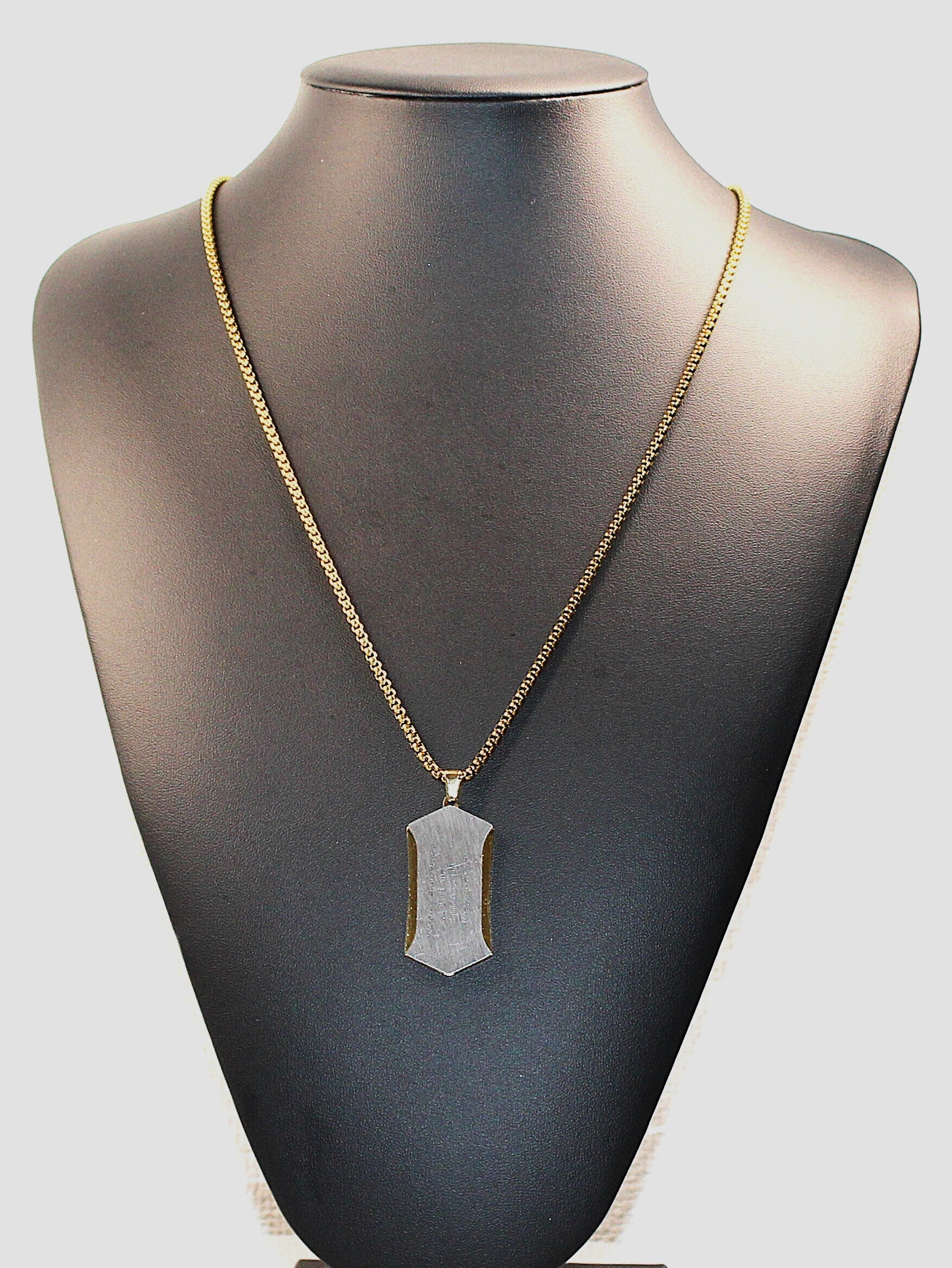 A. 目立ちすぎないよう、フォントサイズ・文字間隔を抑えた設計にしています。近くで見れば読める、遠目ではシンプルなネックレスです。