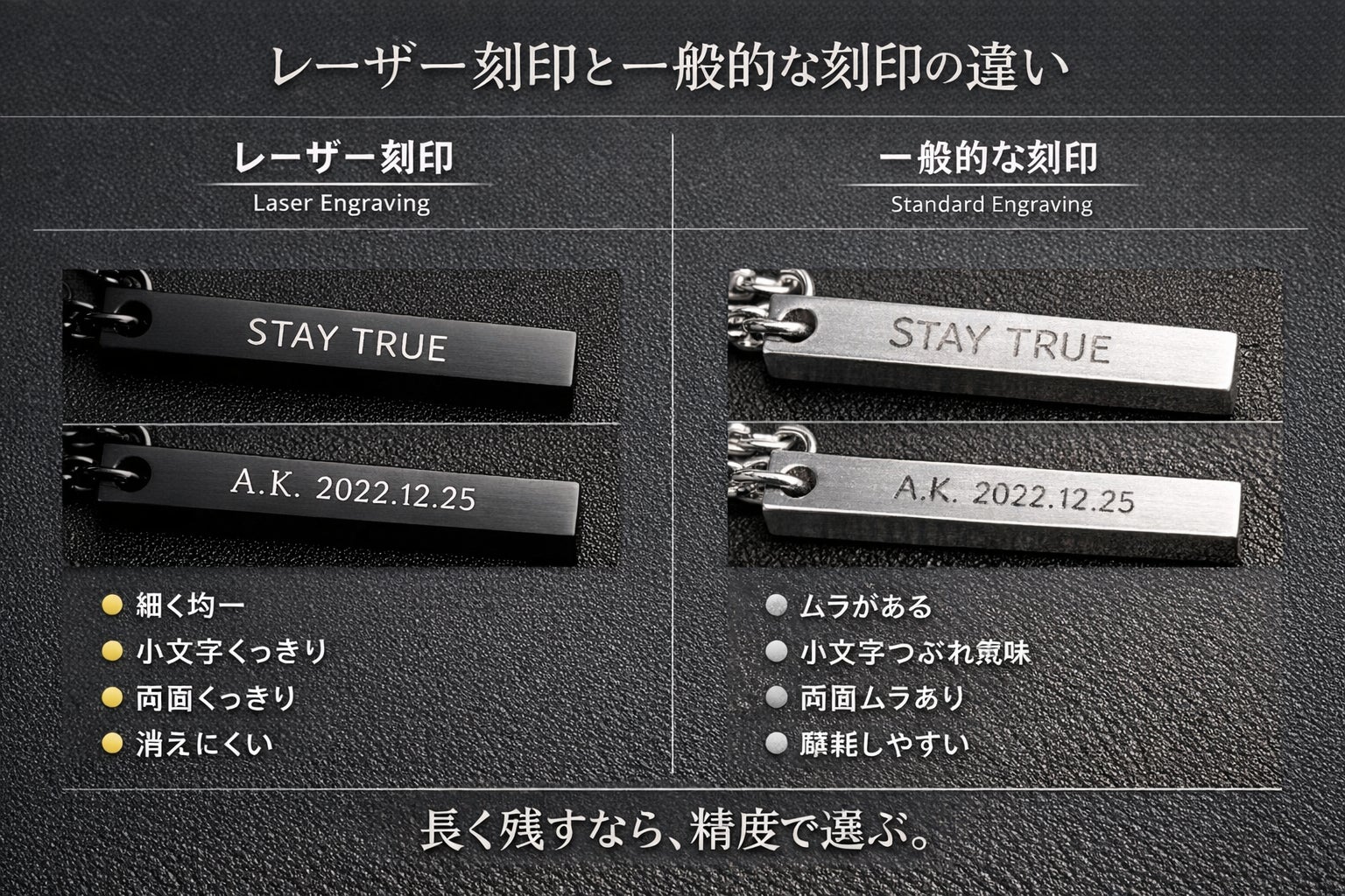 A. 高精度レーザー刻印を採用しているため、日常使用で簡単に消えることはありません。長く身につけることを前提とした刻印です。