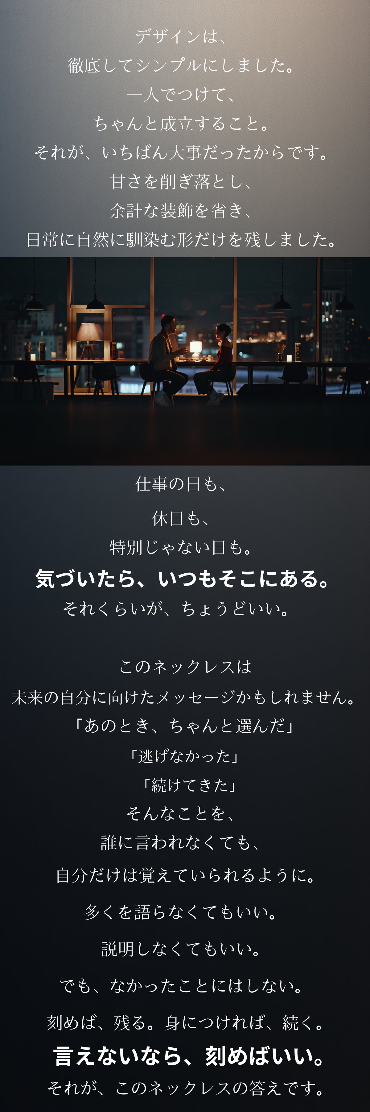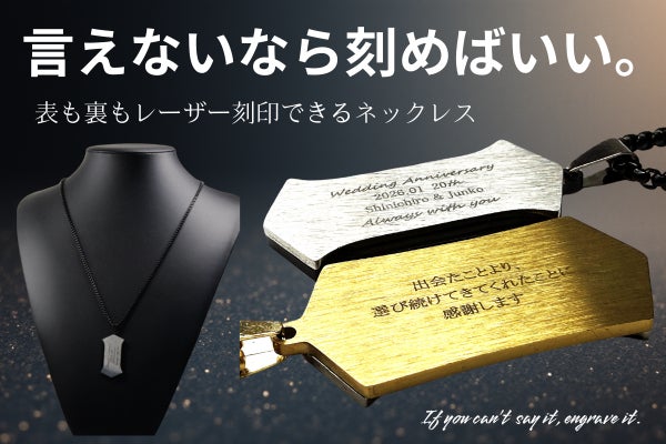 言葉にできなかった想いは、弱さではありません。多くを語らず、行動で示してきたからこそ、言葉が追いつかないだけのこともある。このネックレスは、そんな人のための選択肢です。表に刻む言葉も、裏に刻む言葉も、正解はありません。あなたが「残したい」と思ったものが、そのまま意味になります。誰かのためでもいい。自分のためでもいい。あるいは、その両方でもいい。刻んだ言葉が、ふとした瞬間に視界に入り、触れた指先で思い出される。それだけで、このネックレスは役目を果たします。言えなかった想いを、なかったことにしないために。どうか、あなた自身の言葉を刻んでください。言えないなら、刻めばいい。