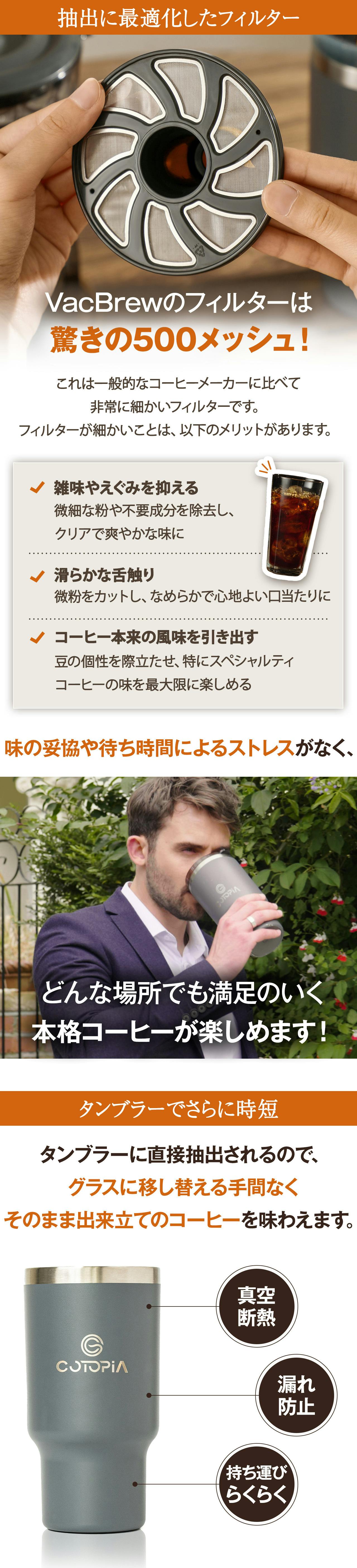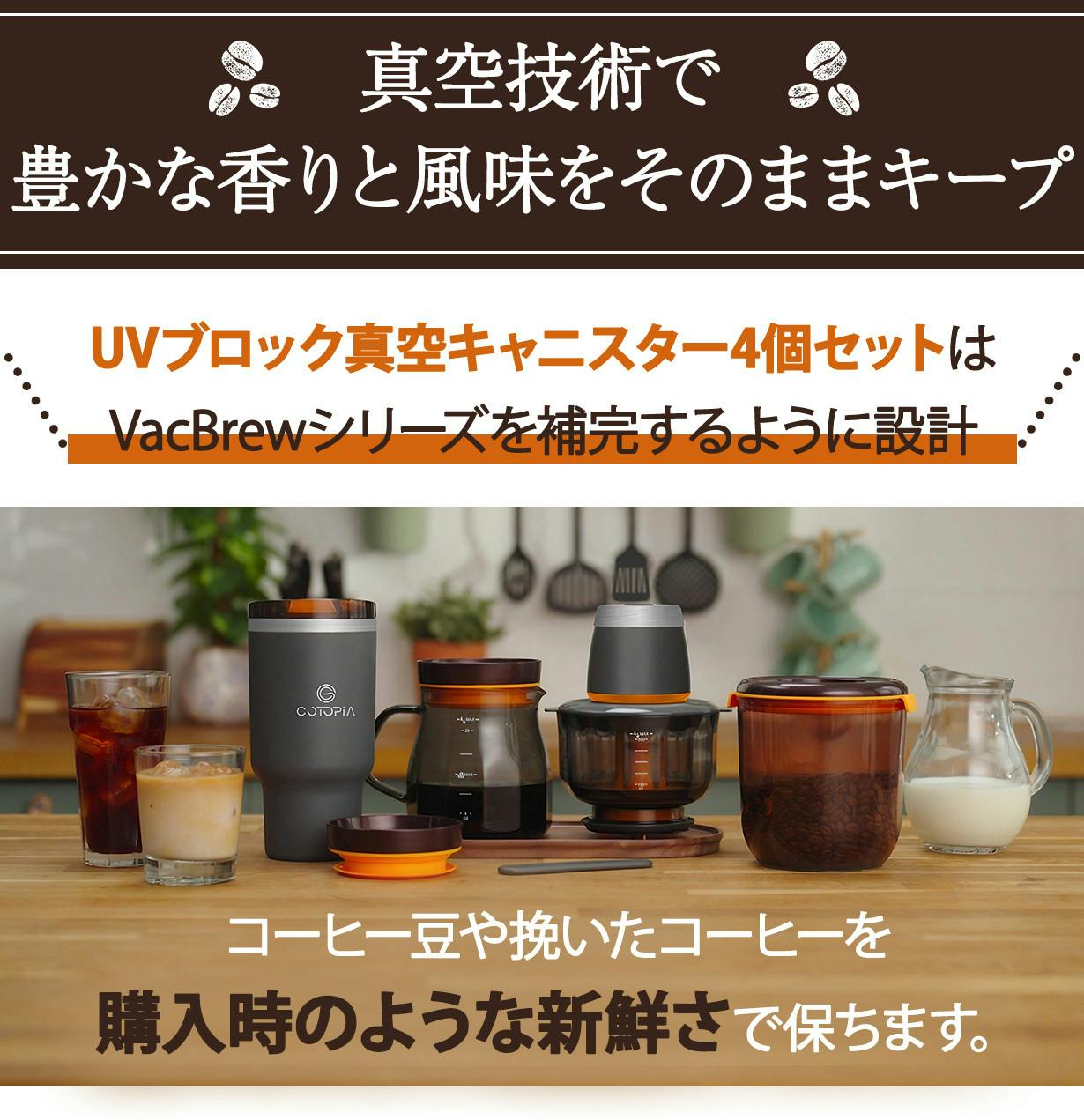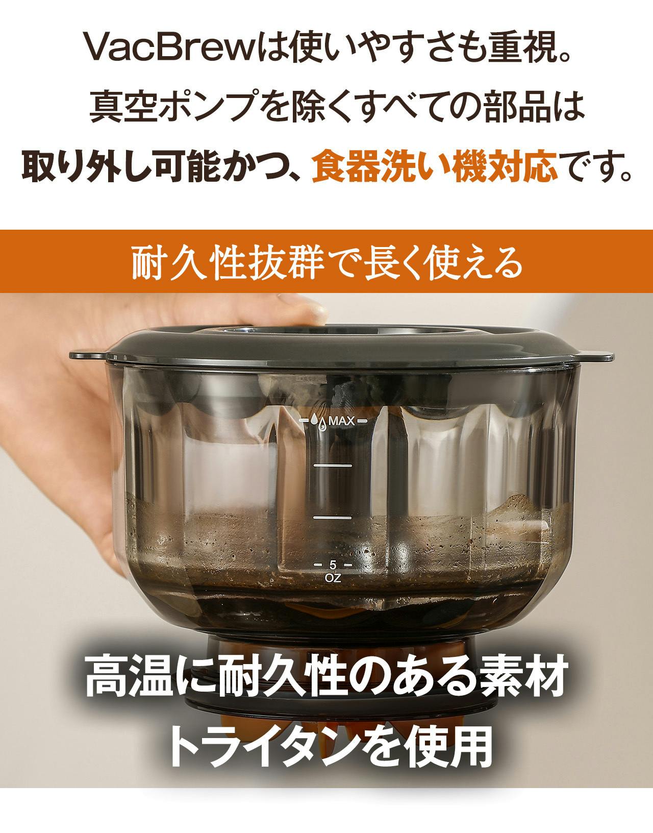 A. VacBrewは、抽出プロセスを加速し、風味を高める実用新案を取得した真空技術で際立っています。さらに、使いやすい操作方法、そしてコーヒー豆をより長く新鮮に保つUVカット真空キャニスターを備えた独自のデザインも備えています。
