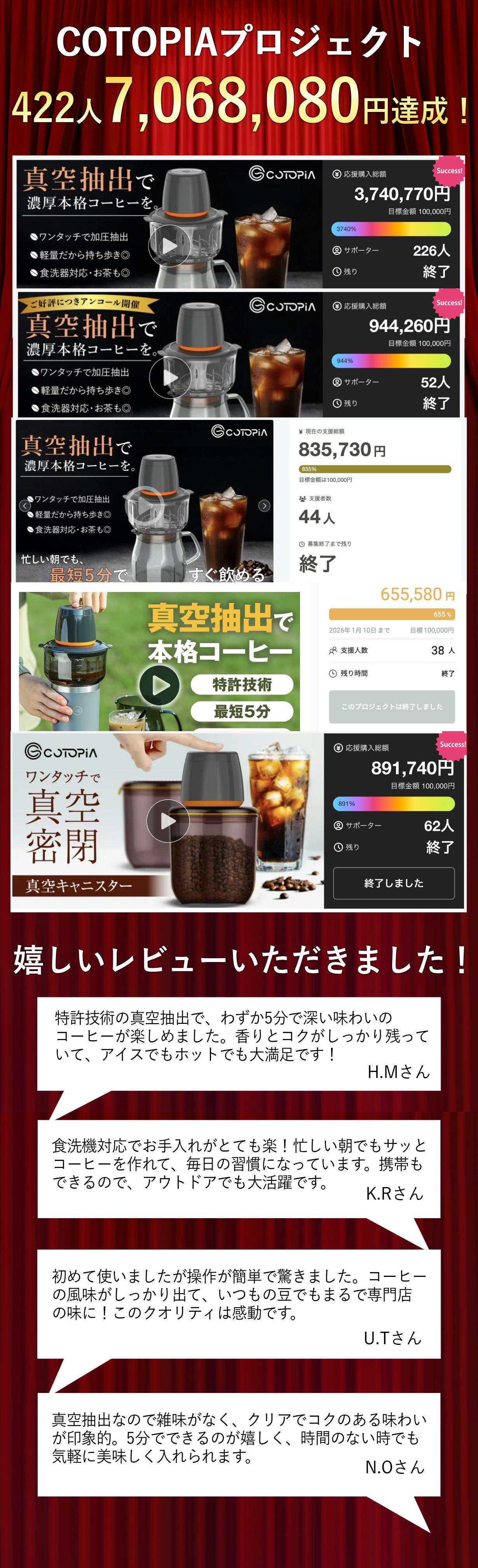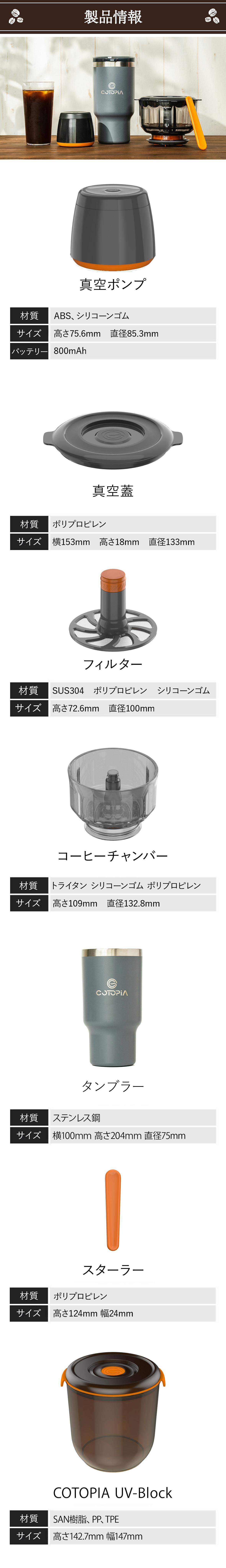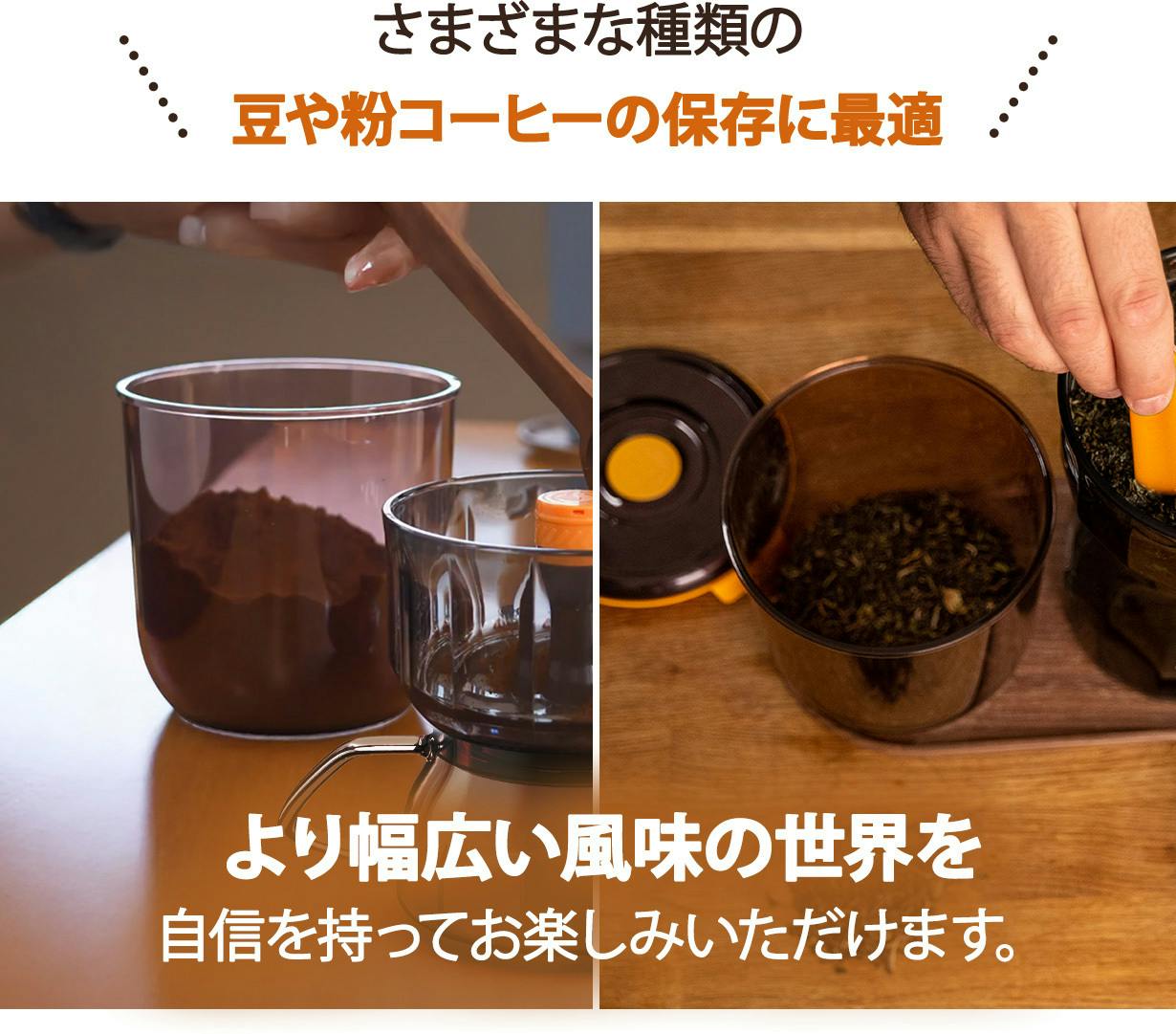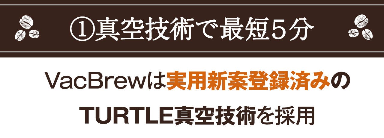 A. VacBrewは、抽出プロセスを加速し、風味を高める実用新案を取得した真空技術で際立っています。さらに、使いやすい操作方法、そしてコーヒー豆をより長く新鮮に保つUVカット真空キャニスターを備えた独自のデザインも備えています。