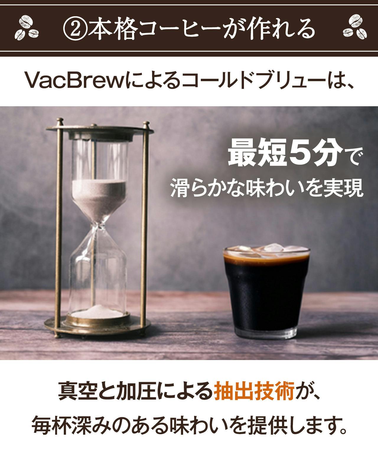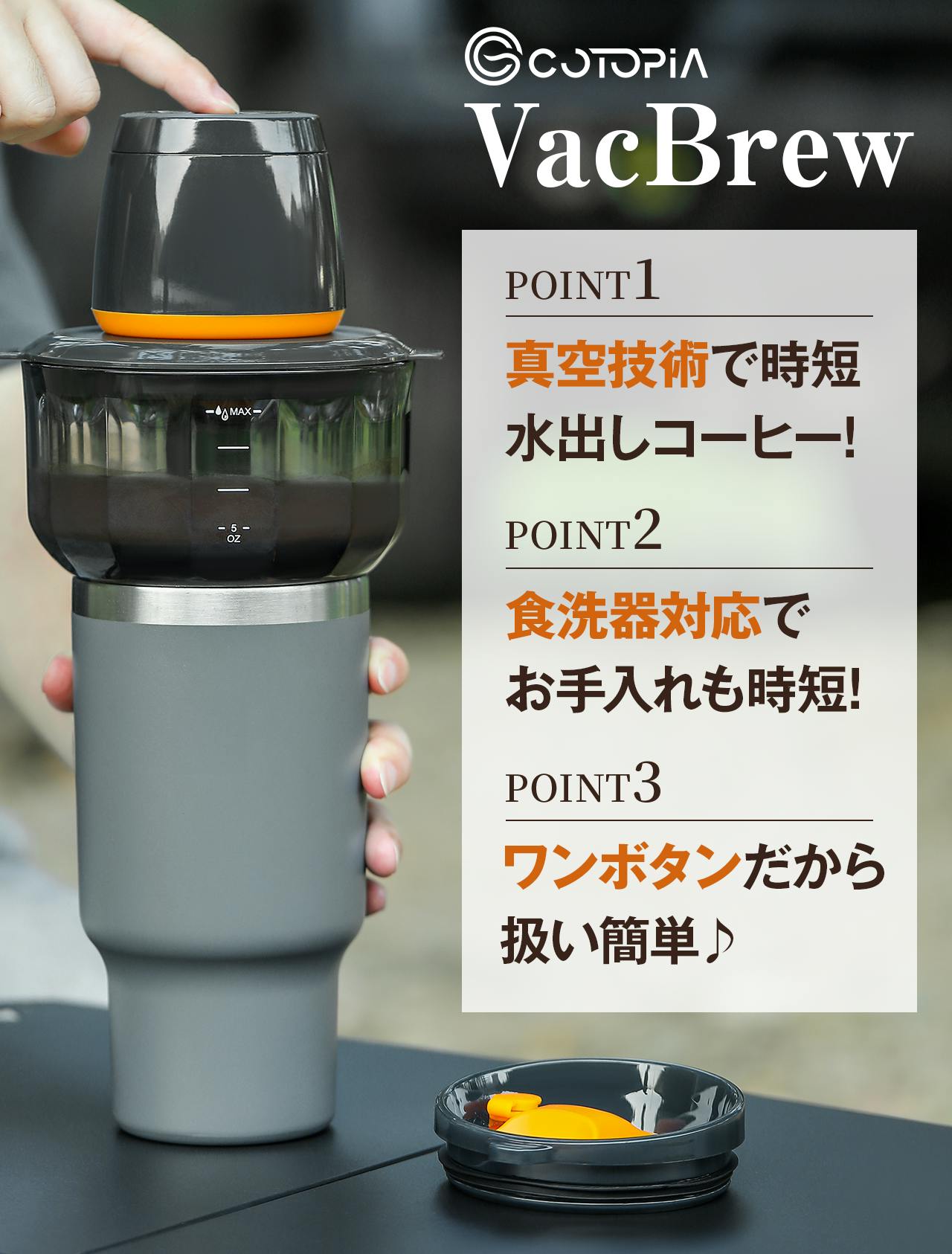 A. VacBrewは、実用新案を取得した真空技術を駆使し、わずか数分で豊かで滑らかなコーヒーの風味を引き出す革新的なコールドブリューコーヒーメーカーです。使いやすいワンボタンコントロール、抽出プロセスを向上させる独自の真空ポンプを備えています。