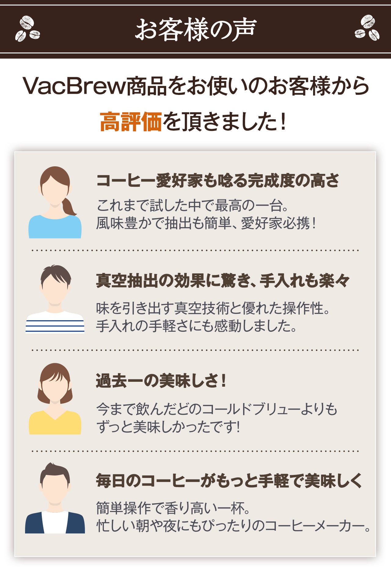 A. VacBrewは、抽出プロセスを加速し、風味を高める実用新案を取得した真空技術で際立っています。さらに、使いやすい操作方法、そしてコーヒー豆をより長く新鮮に保つUVカット真空キャニスターを備えた独自のデザインも備えています。