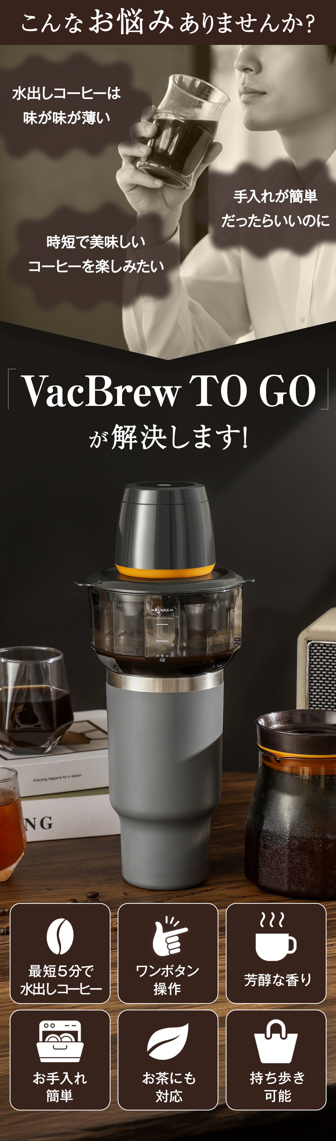 忙しい朝やアウトドアでの冒険に最適なVacBrew To Goは、タンブラーの中で滑らかで風味豊かなコールドブリューを簡単に作ることができます。