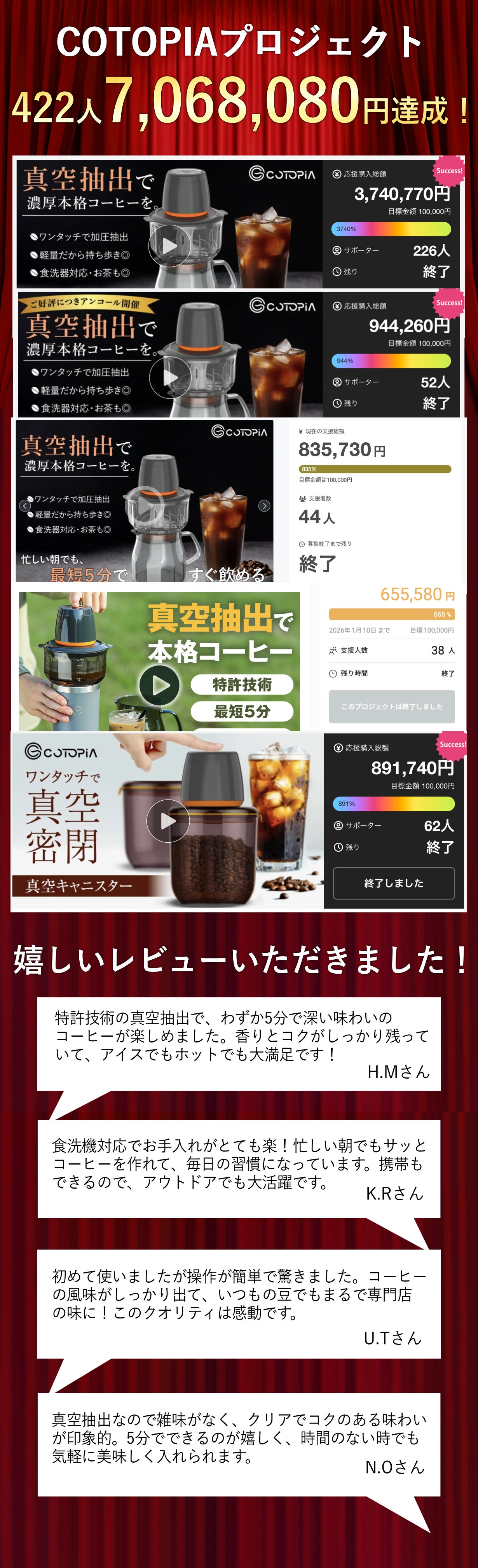 2026/04/13 18:00こんばんは、BRIGHT DIYです。今回はCOTOPIA VacBrew To Goプロジェクトへのリターン追加を紹介させて頂きます。特許技術で深い味わいを最短5分で実現。真空抽出コーヒーメーカー+密封キャニスター高割引率は数量限定です!ページはこちら >>> https://camp-fire.jp/projects/view/922436本日は限定リターンをご紹介!【machi-ya割②】 COTOPIA VacBrew To Go コンボセット ×1セット※数量限定、なくなり次第終了です!!プロジェクトは、4/30 (木) までを予定しておりますので、ご興味のある方はこの機会をお見逃しなく!https://camp-fire.jp/projects/view/922436Brightチームは当プロジェクトをより多くの方へ知って頂きたいと考えております。よかったら、SNSでのシェア・拡散をお願い致します。#cotopia #brightdiyどうぞよろしくお願い致します。Brightチーム もっと見る