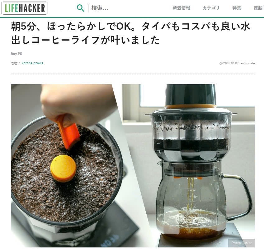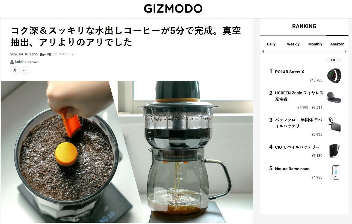 2026/04/15 21:00皆様、こんばんは!Bright DIYチームです。4月10日、GIZMODOで「COTOPIA VacBrew To Go」を紹介して頂きました。話題:コク深&スッキリな水出しコーヒーが5分で完成。真空抽出、アリよりのアリでした興味がある方、是非下記のリンクからアクセスしてみてください。https://www.gizmodo.jp/2026/04/machi-ya-vacbrewtogo-review-922436.html【レビューの一部抜粋】〈ほったらかしOK、着替えている間に終わる準備ができたらフタとポンプをセットしてスイッチをオン。抽出モードは3種類から選べますが、今回は最短の5分で試してみました。時間を計ってみるとちょうど5分で下に押し出されていきました。上部の強力なポンプ(最大-450mBar)が作り出す真空状態により、数時間寝かした水出しコーヒーと同等の抽出がこのスピードで実現するのだそう。同じ豆でホットドリップも嗜んでいるので味の違いがはっきり分かりました。熱が加わっていないことで苦味が少なく、しっかり濃さやコクは感じるのにごくごく飲めるスッキリ感が絶妙ですね!氷をたっぷり入れれば上質なアイスコーヒーが完成。濃いめが好みであれば少し時間は伸びますが、8分や12分のじっくり抽出モードも選べますよ。〉ご興味のある方はこの機会をお見逃しなく!https://camp-fire.jp/projects/922436/view4月30日まで販売期間は続きますので、ぜひSNSでのシェアや身近な方にもおすすめしていただけると嬉しく思います。#cotopia #brightdiyどうぞよろしくお願い致します。BRIGHTチーム もっと見る