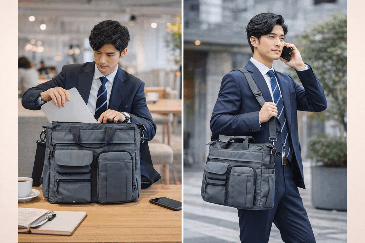 手提げ/肩掛け/リュック の3スタイルを一瞬で切り替え可能。