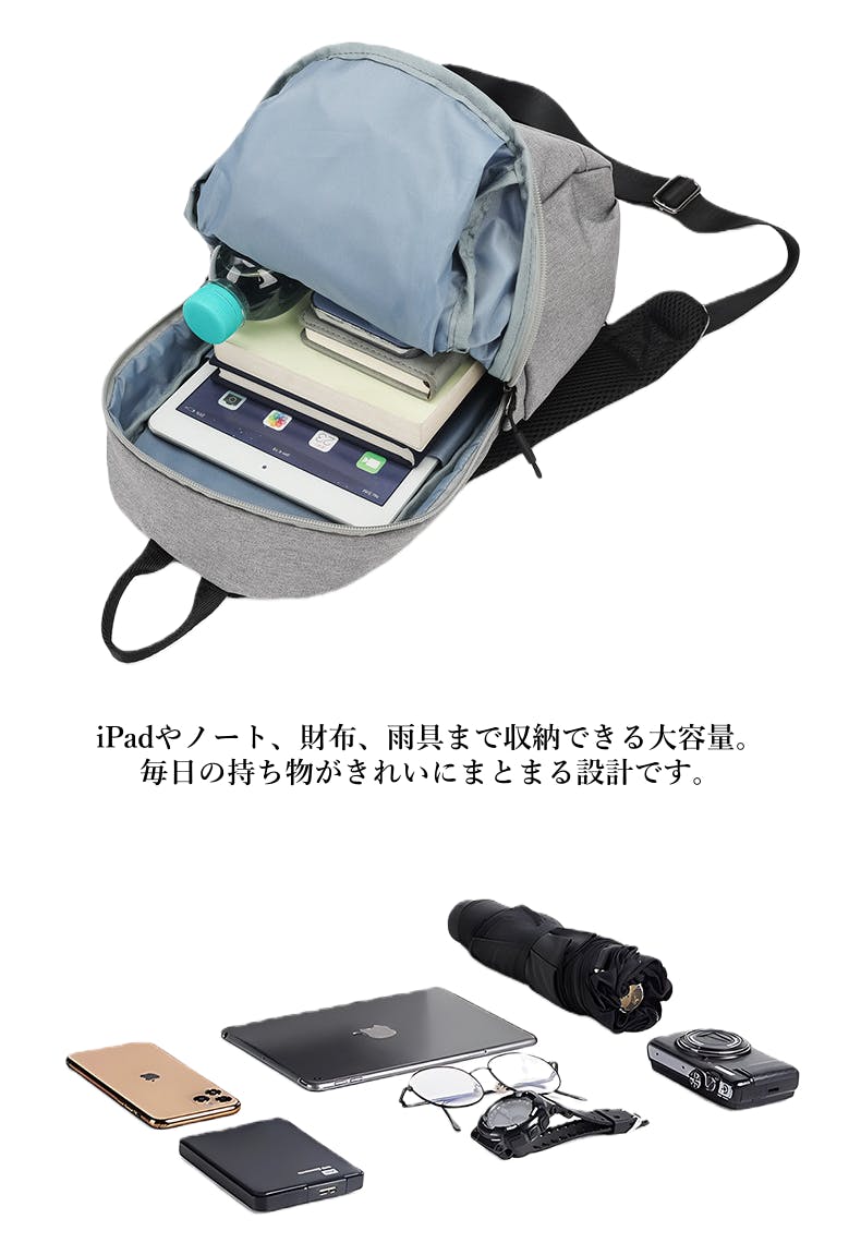 iPad、ノート、財布、折りたたみ傘、ボトルなど、毎日の必需品がスッキリまとまります。