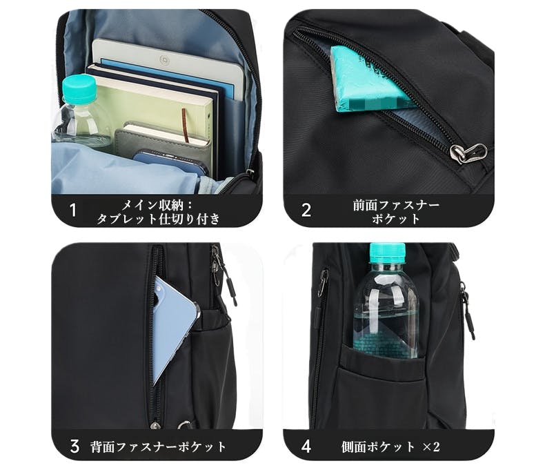 iPad収納、撥水素材、多収納ポケット、肩への負担軽減設計など、
