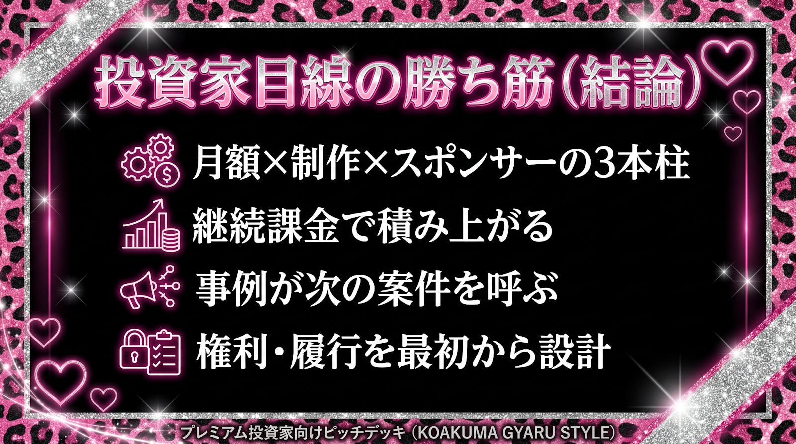 うちら、派手に見えるかもだけど、やりたいのは“盛る”じゃなくてちゃんと回る仕組みを作ること。権利は守る、履行は落とさない、数字で改善する。このプロジェクト、応援してくれたらうれしい。いっしょに実現しよ?