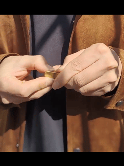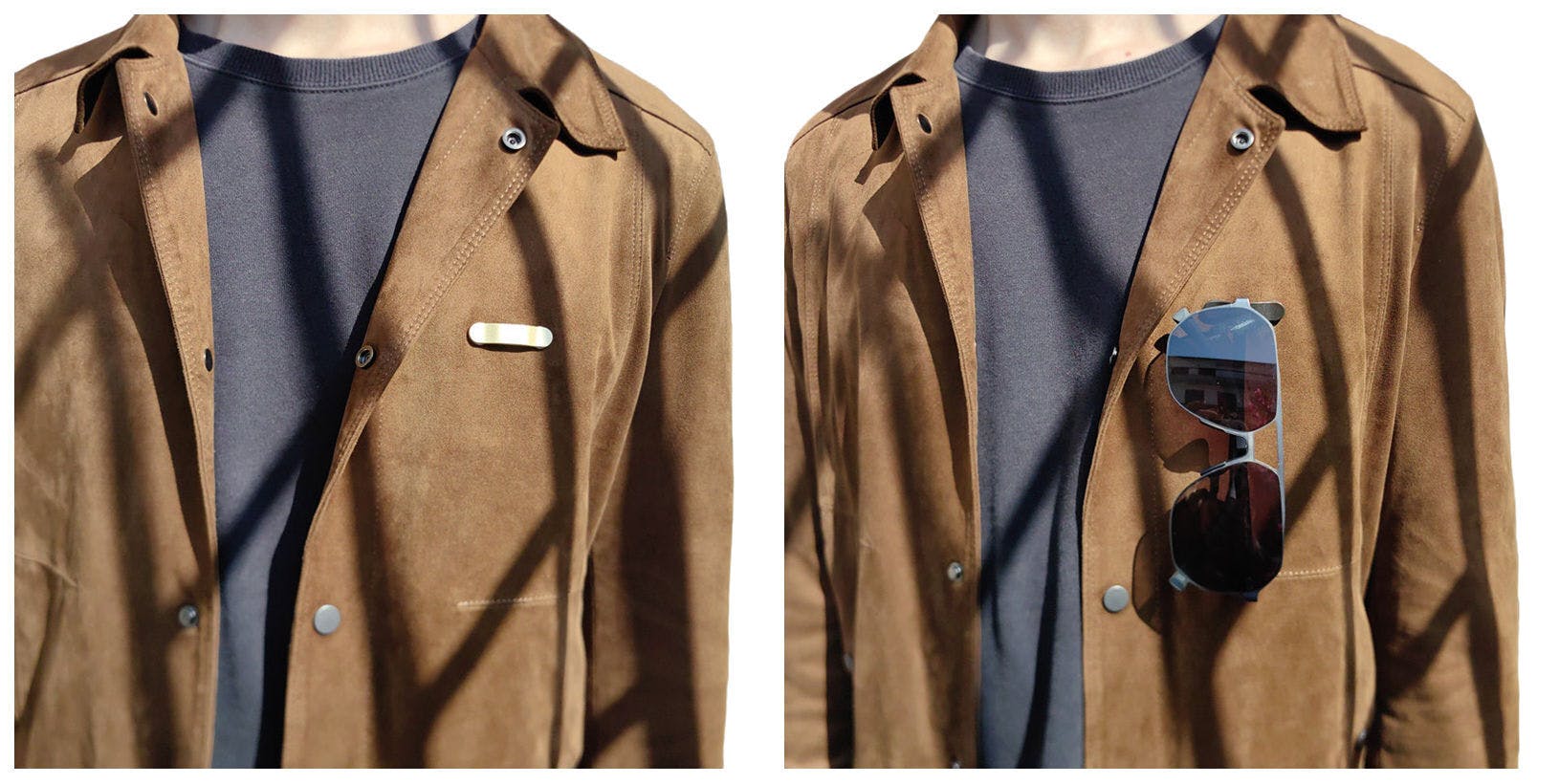 裏側のマグネットを服の内側に当て、表側の本体に近づけるだけ。