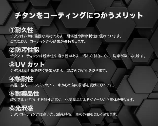 チタンコーティングは航空機や宇宙開発にも使われるほど強靭なため、汚れや傷から徹底的に車を保護します。