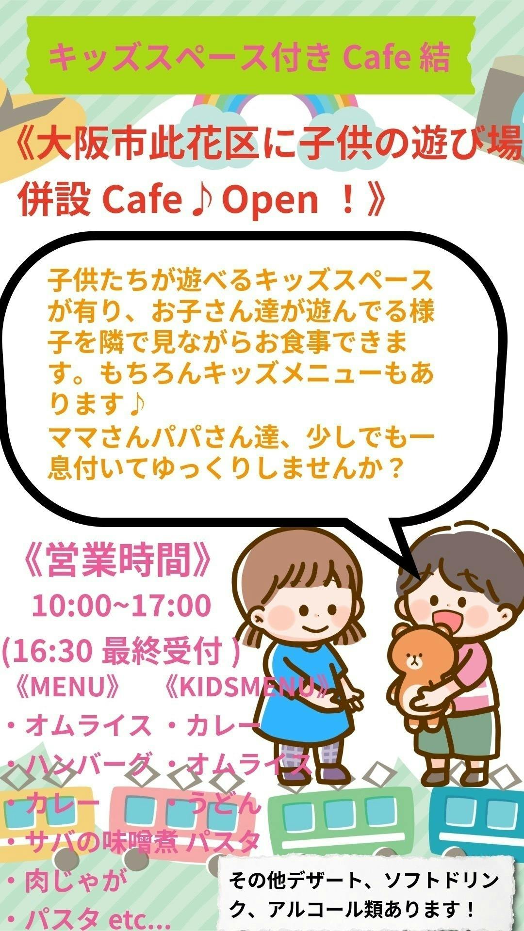 現在此花区ではママさんパパさんがほっと一息つけてお子さん達も楽しめるような場所がありません。そこで、大阪市此花区に親子Cafe結をオープンし、お子さん達が楽しく遊びながらママさんパパさん達が安心して過ごせる場所を提供したいと考えています。親子で過ごせる空間を提供し、地域の皆様にとって憩いの場となることを目指しています。また、地域住民の交流の場としても考えており、様々な方々の集いの場所になればいいなと思っております。私も現在子供が3人いてますので育児の悩みを相談し合ったり息抜きしながら楽しめる場所を作りたいです。この場所はママ友さんの溜まり場、ひとりでフラッと子ども連れてきた、家族で遊びに来た、子供はいないけどカフェスペースで一息ついたりお話しに来た等、気軽に立ち寄れる場所を作りたいです。此花区をもっと子育てのしやすい、楽しみやすい場所にしたいと考えております。
