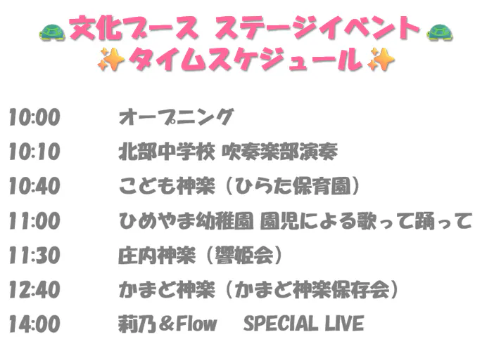 文化ブースは会場内ステージで伝統の神楽、地元学校による演奏、プロのライブ等行います。