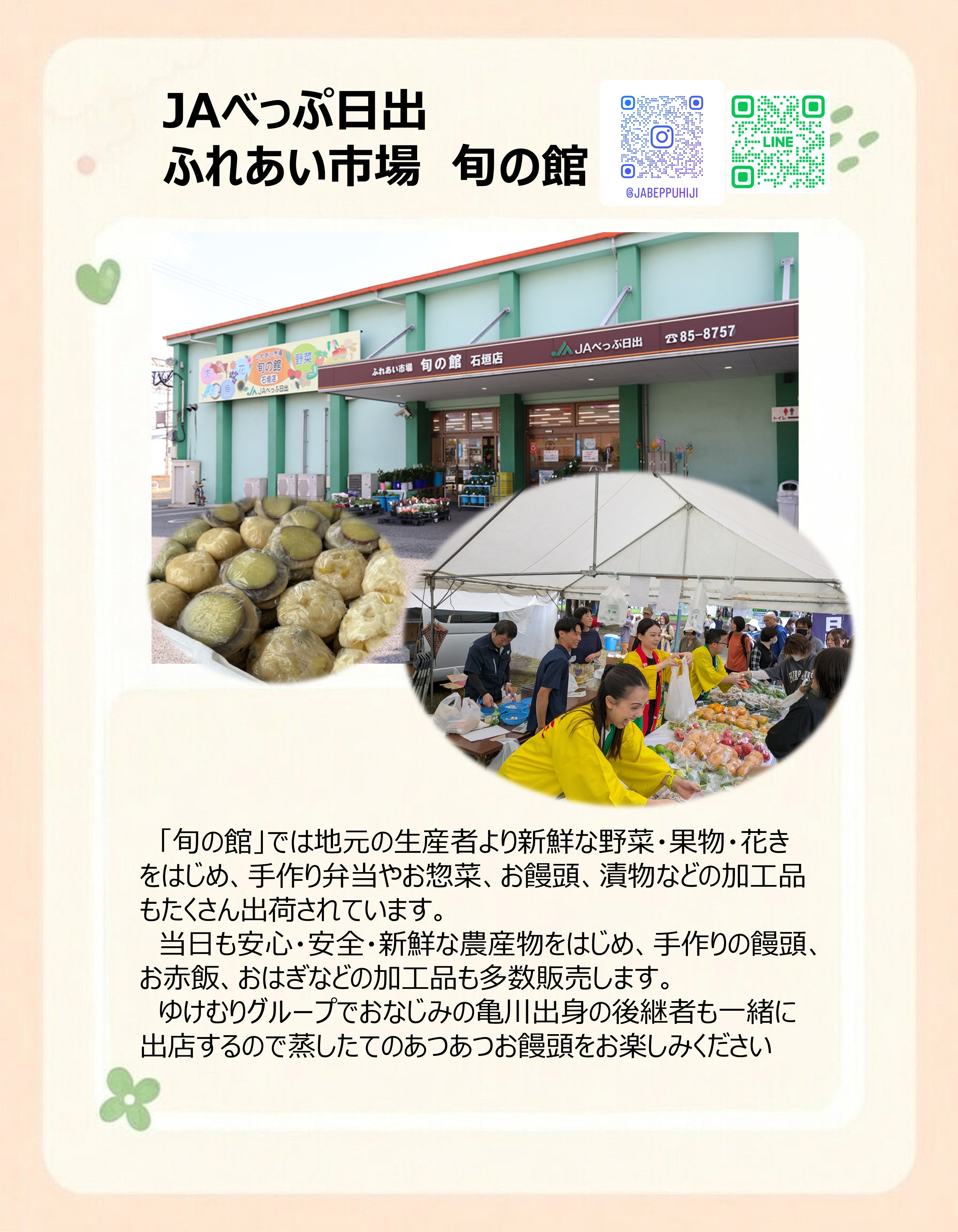 食のブースでは市場ならではの産直新鮮野菜の販売、別府で長く愛される豚まんやパンなどが並びます。