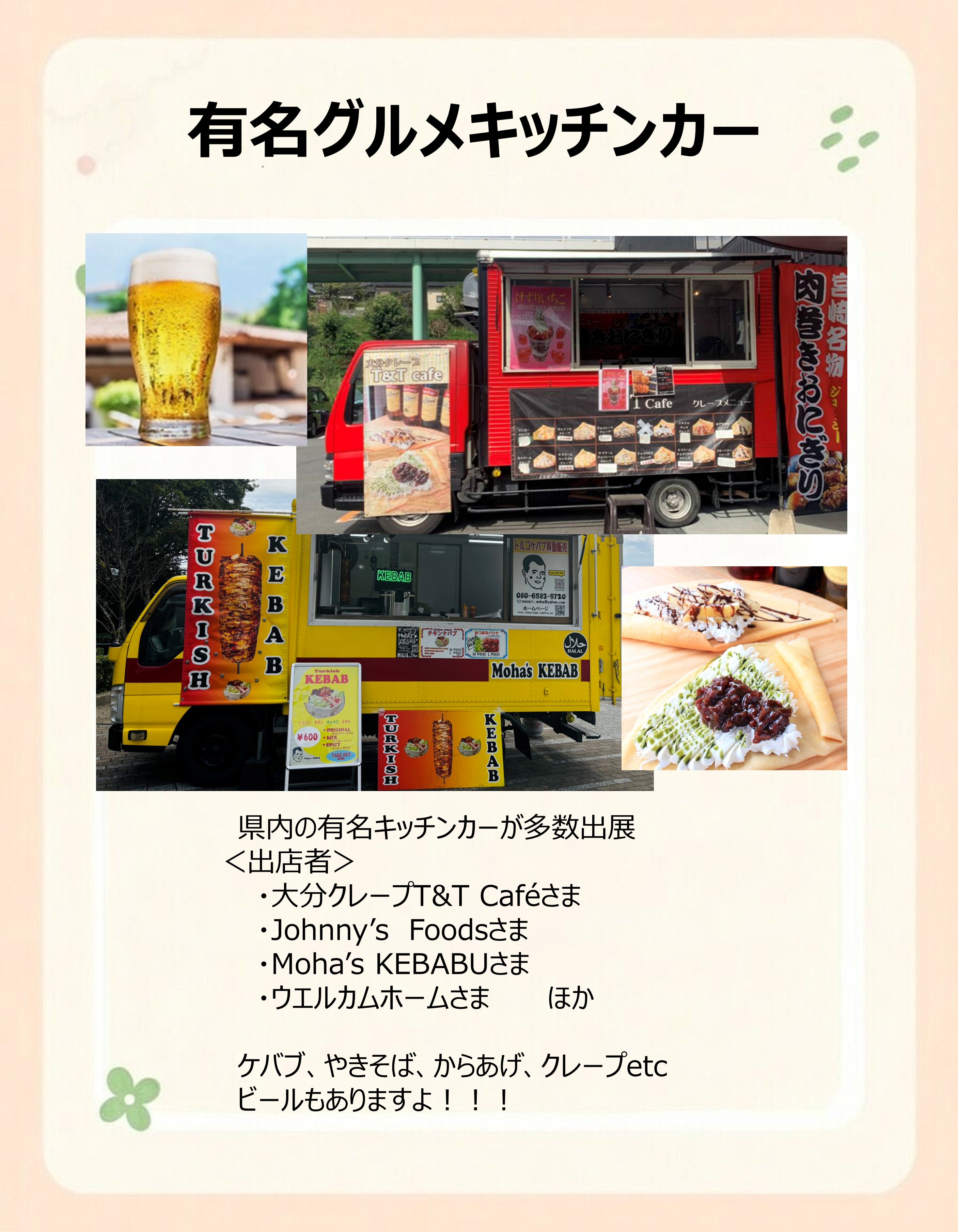 キッチンカーも多数来場しますので、ゆっくりとグルメを堪能ください。