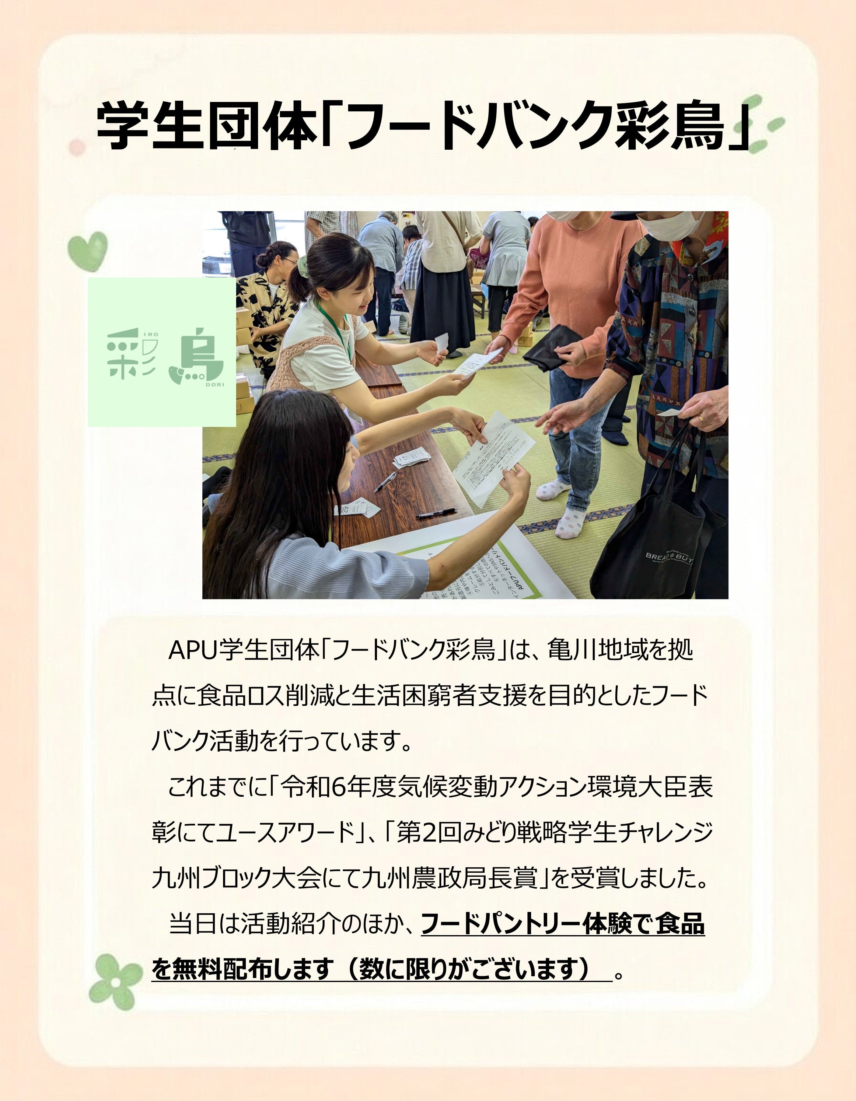 また、当日は「フードバンク彩鳥」によるフードパントリー(無料配布:数量限定)も行います。