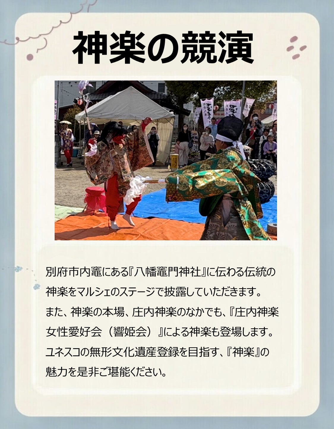 『文化』・・・神楽は日本の伝統的な民俗芸能であり、ユネスコの無形文化遺産登録を目指す取り組みが進行中です。亀川には昔からかまど神楽があります。私の記憶では物心ついた時から八幡竈神社で大みそかの夜から元旦にかけて祝いの舞を披露頂いていた記憶があります。今では、亀川や上人地区のイベントで舞っていただきますが、もっと多くの方々に亀川の文化を知っていただきたいと思い「神楽」にスポットライトを当てました。