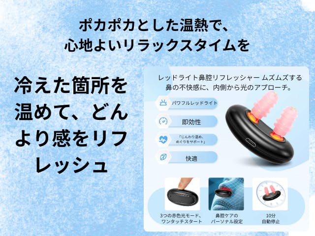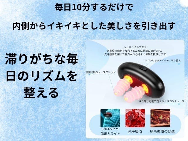 2026/01/25 19:44● 本製品は630〜650nmの赤色光LEDを活用したセルフケア機器(生活雑貨)です。● 鼻まわりにやさしい光を当てるという新しい習慣として設計されています。● 光の特性を活かした提案は、ライフスタイルの一部として注目されており、日々のコンディション管理にご活用いただけます。● 本製品は医療機器ではなく、特定の疾病の診断・治療・予防を目的としたものではありません。 もっと見る