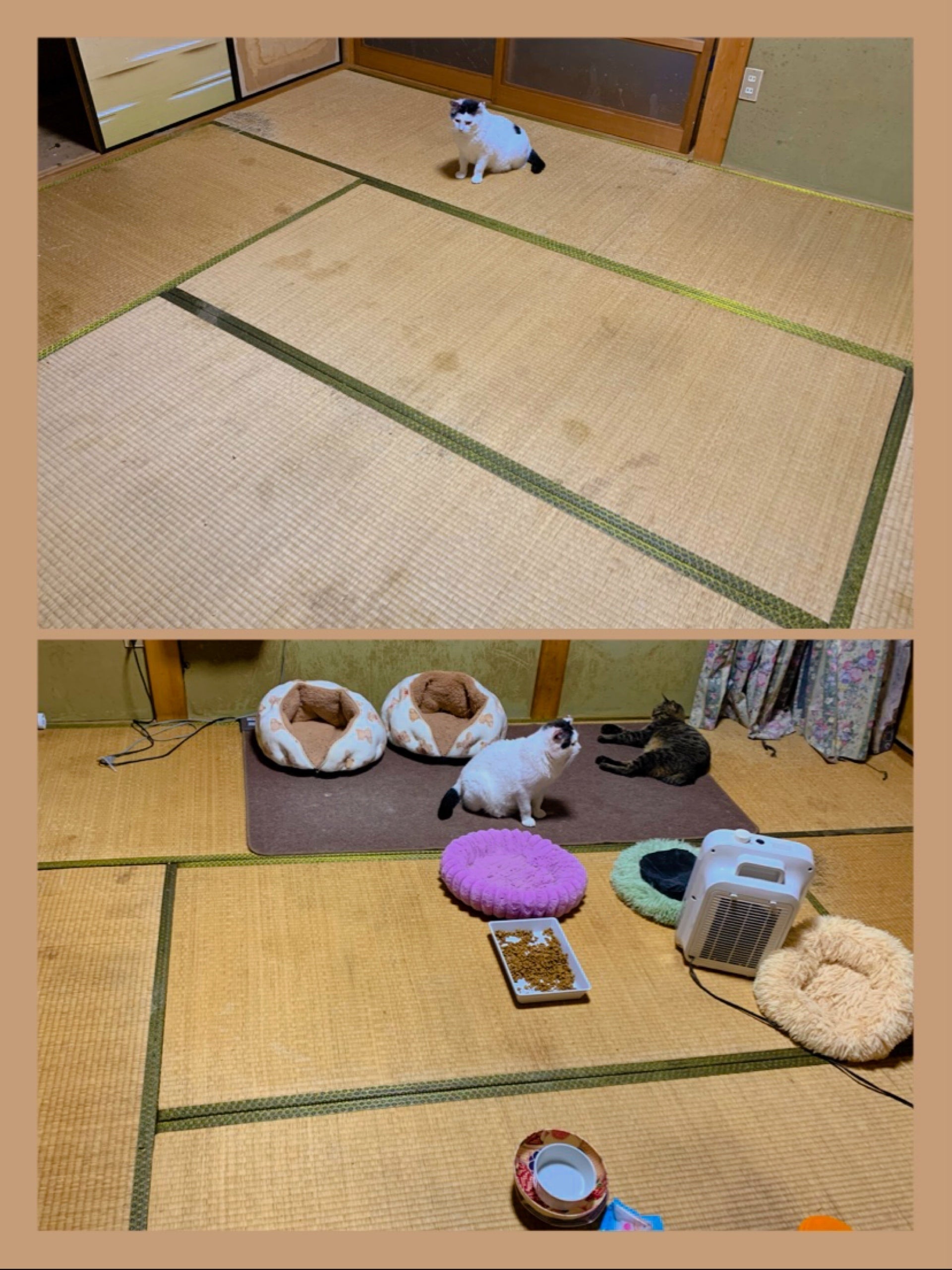 施設開設当初は1箇所の建物でしたが、施設裏にある持家を2箇所の猫シェルターとして現在は利用しています。2箇所目の2階、和室の2部屋の畳をフローリングの床にリフォームしたいと考えています。畳をフローリングに張り替えることで日々の掃除がしやすくなり清潔な環境が整います。そこに必要に応じて高さのある組み立て式のケージを置き、冷暖房エアコンを設置したい。特に温度調節が難しい高齢猫や病中病後、ケガを負った猫が安心して過ごせる空間の確保を最優先に考えています
