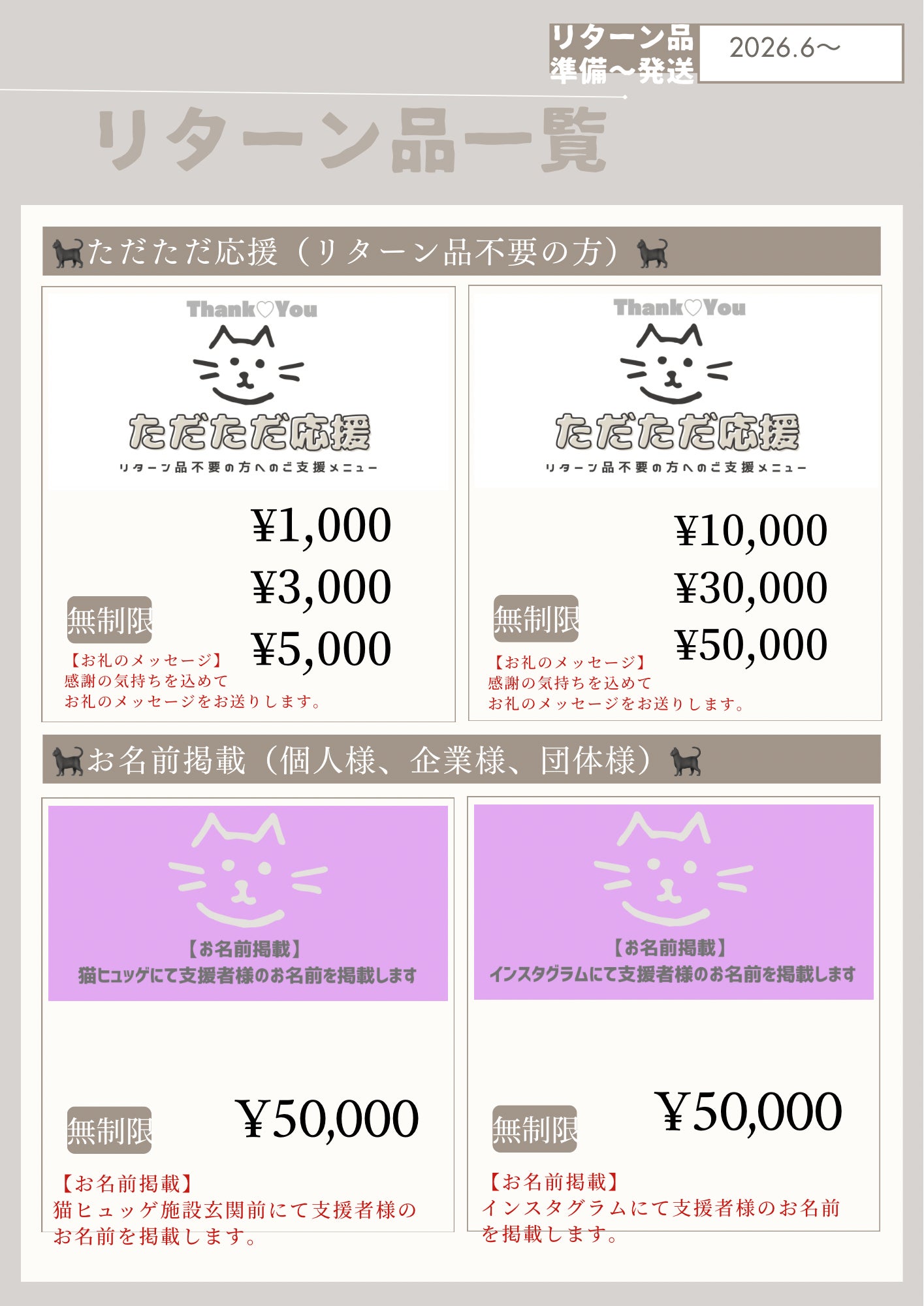 2026/04/08 20:19日頃より猫ヒュッゲの活動にご支援・ご協力いただきますみなさまには感謝申し上げますクラウドファンディング開始から約1ヶ月が経ち、たくさんの方々からのご支援ご協力をいただいたおかげでこのたび、4/5に目標金額である100万円を無事に達成させていただくことができました。スタッフ一同、心より深く御礼申し上げます。ご支援・ご協力いただいたみなさま、本当にありがとうございました。クラウドファンディング開始から今日まで、予想を超えるたくさんの方が応援・ご支援していただき、温かいメッセージやSNSでのシェアまでいただくことで、私たちの思いが多くの方々に広まり、たくさんの方に励まされていると実感する日々でした本プロジェクトを立ち上げたきっかけは、[ちいさな命を守りたい]その一心で始めた挑戦でしたその想いが、みなさまひとりひとりの優しさ愛のある行動のおかげでこんなにも大きな力になること。ちいさな命に大きな愛をの意味を改めて実感しています。立ち上げ当初は、果たして本当に多くの方の目に止まりその想いがちゃんと届くのか、そして目標金額を達成させていただけるのかという不安な気持ちも、正直なところ抱えていました。しかし、日を追うごとに寄せられるご支援や励ましのお言葉に背中を押していただき、その不安は次第に「必ず実現させていただきたい!」という強い決意へと変わっていきました。ひとつひとつのご支援と応援のお言葉が、猫たちや私たちスタッフにとって大きな力となっています。みなさまのお力のおかげで、療養部屋のリフォームやエアコン設置といった今回のプロジェクトに必要な資金が無事に集まり、プロジェクトを実行させてもらえることができます!猫たちがより快適に安心して過ごせる空間を実現するため、責任をもって大切にご支援金を活用させていただきます改めて心から感謝の気持ちを込めてみなさま、たくさんのご支援・あたたかい応援・ご協力いただき本当に本当にありがとうございました。スタッフ一同、喜びと感謝の気持ちでいっぱいです。今後とも猫たちのための活動をあたたかく見守りいただけますと幸いですまた目標金額100万円は達成しましたが、プロジェクト終了期間(4/30迄)までにいただいたご支援については保護猫のための活動資金や設備の拡充、継続的な運営のため有効に使わせていただきます。進捗や現場の様子は随時活動報告でお知らせします。終了期間(4/30迄)はご支援可能です。引き続き、周囲の方たちに拡散していただけると大変ありがたいですよろしくお願いいたします。 もっと見るフリーマケットの御礼