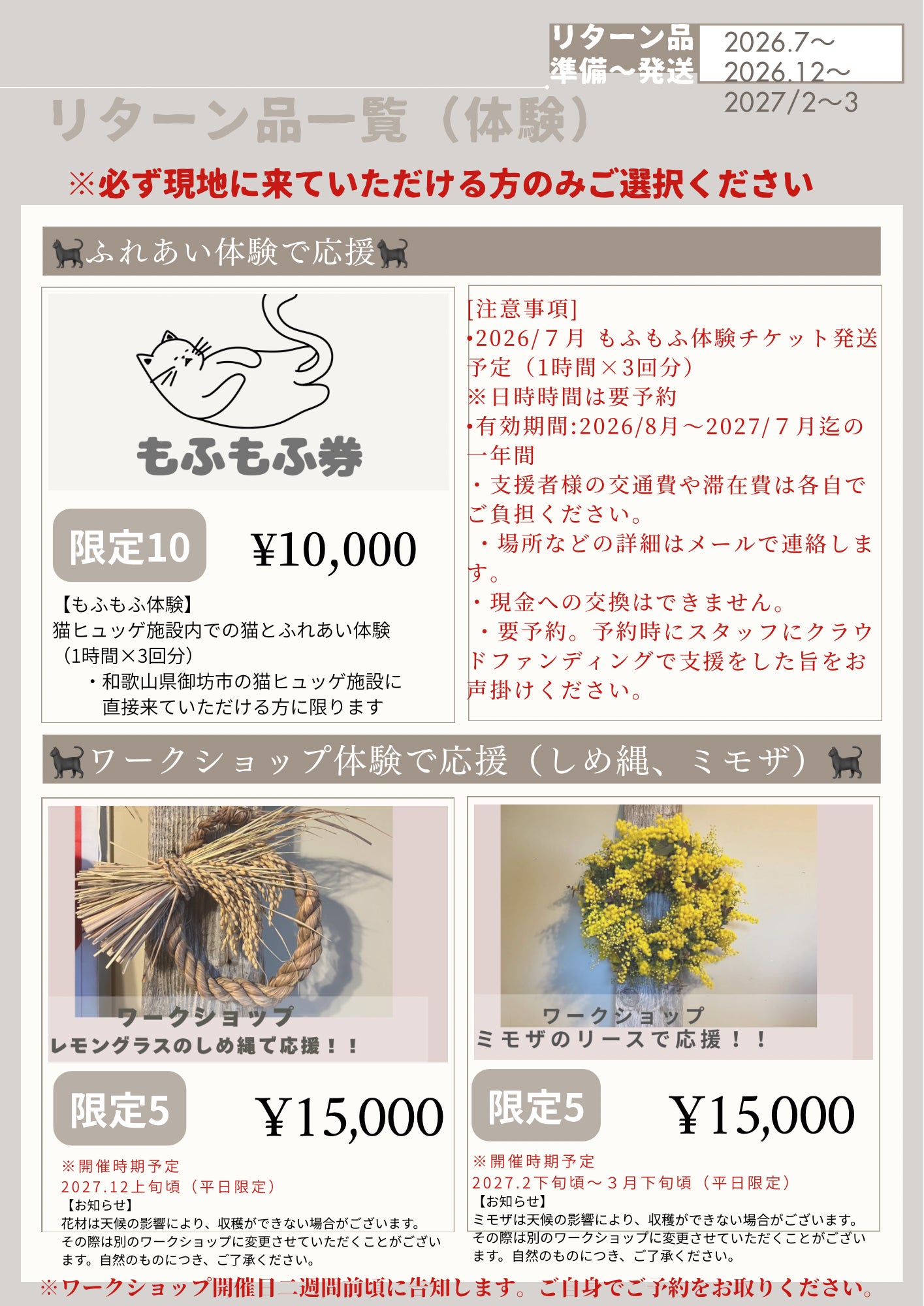 ※リターン品に体験を選択された方は、必ず現地(和歌山県御坊市内猫ヒュッゲ施設、和歌山県日高郡印南町内サンシャインガーデン)に直接来ていただける方のみご選択ください