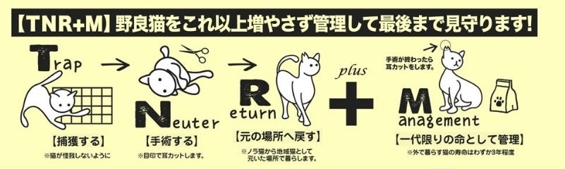 ※TNR+Mとは、野良猫を殺傷することなく一代限りの命として不幸な子猫の誕生を防ぎ、増やさないだけでなく、今いる命も守っている活動のことです。