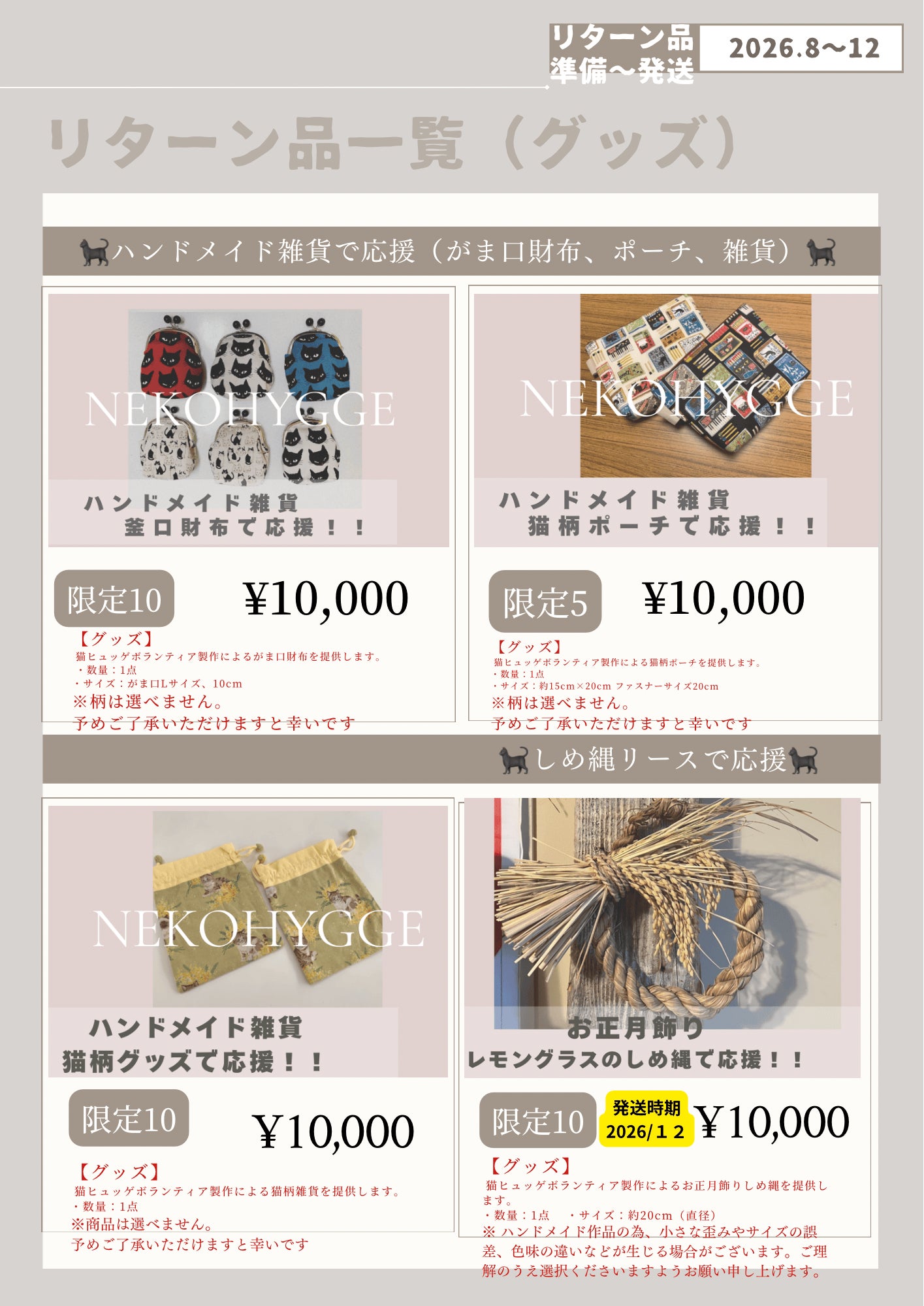 2026/04/08 20:19日頃より猫ヒュッゲの活動にご支援・ご協力いただきますみなさまには感謝申し上げますクラウドファンディング開始から約1ヶ月が経ち、たくさんの方々からのご支援ご協力をいただいたおかげでこのたび、4/5に目標金額である100万円を無事に達成させていただくことができました。スタッフ一同、心より深く御礼申し上げます。ご支援・ご協力いただいたみなさま、本当にありがとうございました。クラウドファンディング開始から今日まで、予想を超えるたくさんの方が応援・ご支援していただき、温かいメッセージやSNSでのシェアまでいただくことで、私たちの思いが多くの方々に広まり、たくさんの方に励まされていると実感する日々でした本プロジェクトを立ち上げたきっかけは、[ちいさな命を守りたい]その一心で始めた挑戦でしたその想いが、みなさまひとりひとりの優しさ愛のある行動のおかげでこんなにも大きな力になること。ちいさな命に大きな愛をの意味を改めて実感しています。立ち上げ当初は、果たして本当に多くの方の目に止まりその想いがちゃんと届くのか、そして目標金額を達成させていただけるのかという不安な気持ちも、正直なところ抱えていました。しかし、日を追うごとに寄せられるご支援や励ましのお言葉に背中を押していただき、その不安は次第に「必ず実現させていただきたい!」という強い決意へと変わっていきました。ひとつひとつのご支援と応援のお言葉が、猫たちや私たちスタッフにとって大きな力となっています。みなさまのお力のおかげで、療養部屋のリフォームやエアコン設置といった今回のプロジェクトに必要な資金が無事に集まり、プロジェクトを実行させてもらえることができます!猫たちがより快適に安心して過ごせる空間を実現するため、責任をもって大切にご支援金を活用させていただきます改めて心から感謝の気持ちを込めてみなさま、たくさんのご支援・あたたかい応援・ご協力いただき本当に本当にありがとうございました。スタッフ一同、喜びと感謝の気持ちでいっぱいです。今後とも猫たちのための活動をあたたかく見守りいただけますと幸いですまた目標金額100万円は達成しましたが、プロジェクト終了期間(4/30迄)までにいただいたご支援については保護猫のための活動資金や設備の拡充、継続的な運営のため有効に使わせていただきます。進捗や現場の様子は随時活動報告でお知らせします。終了期間(4/30迄)はご支援可能です。引き続き、周囲の方たちに拡散していただけると大変ありがたいですよろしくお願いいたします。 もっと見るフリーマケットの御礼